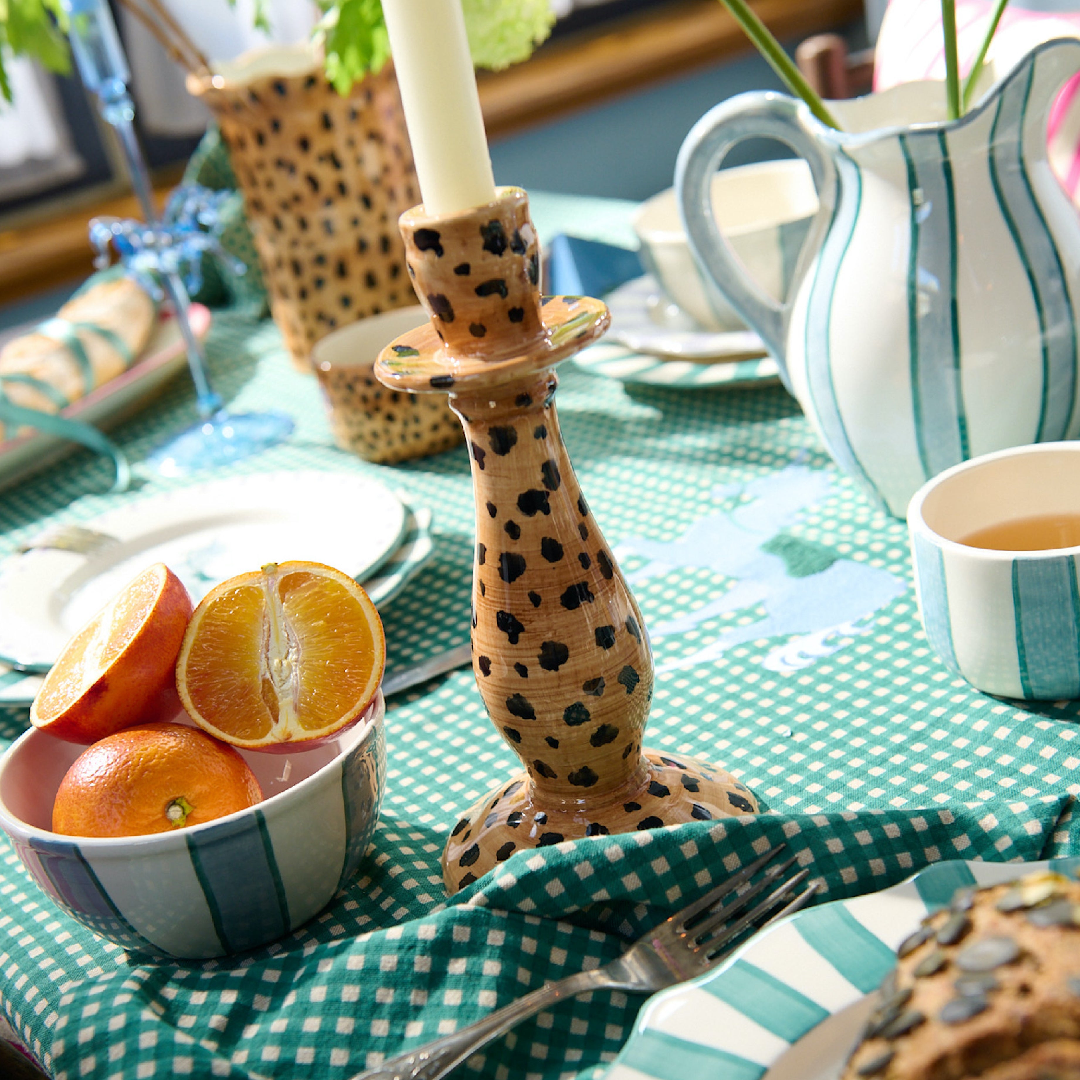 Anna + Nina’s candle holder celebrates the wild side. Carefully crafted from ceramic, it features a classic ornamental silhouette and boasts a hand-painted leopard print motif with a high gloss finish. Whether containing a candle stick or displayed without - Anna + Nina’s candle holder is the go-to for maximal interiors.