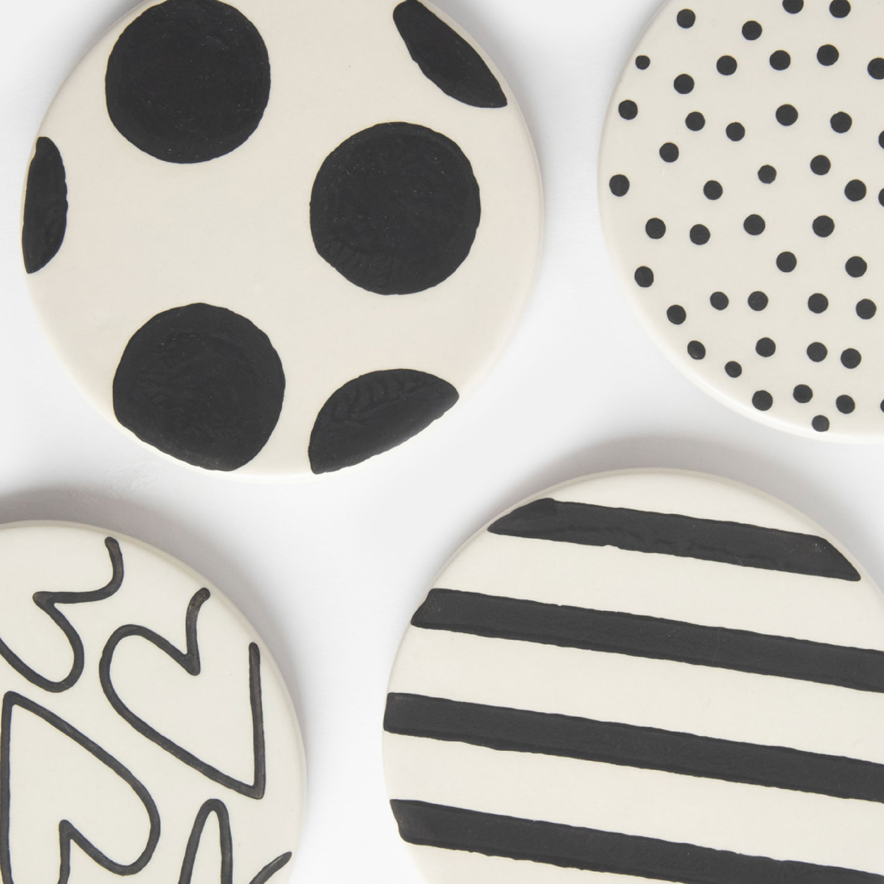Add some bold monochrome style to your living space with Caroline Gardner’s set of 4 stoneware coasters. Each coaster has anti-slip feet and is hand painted with a different bold black design on an off white base.