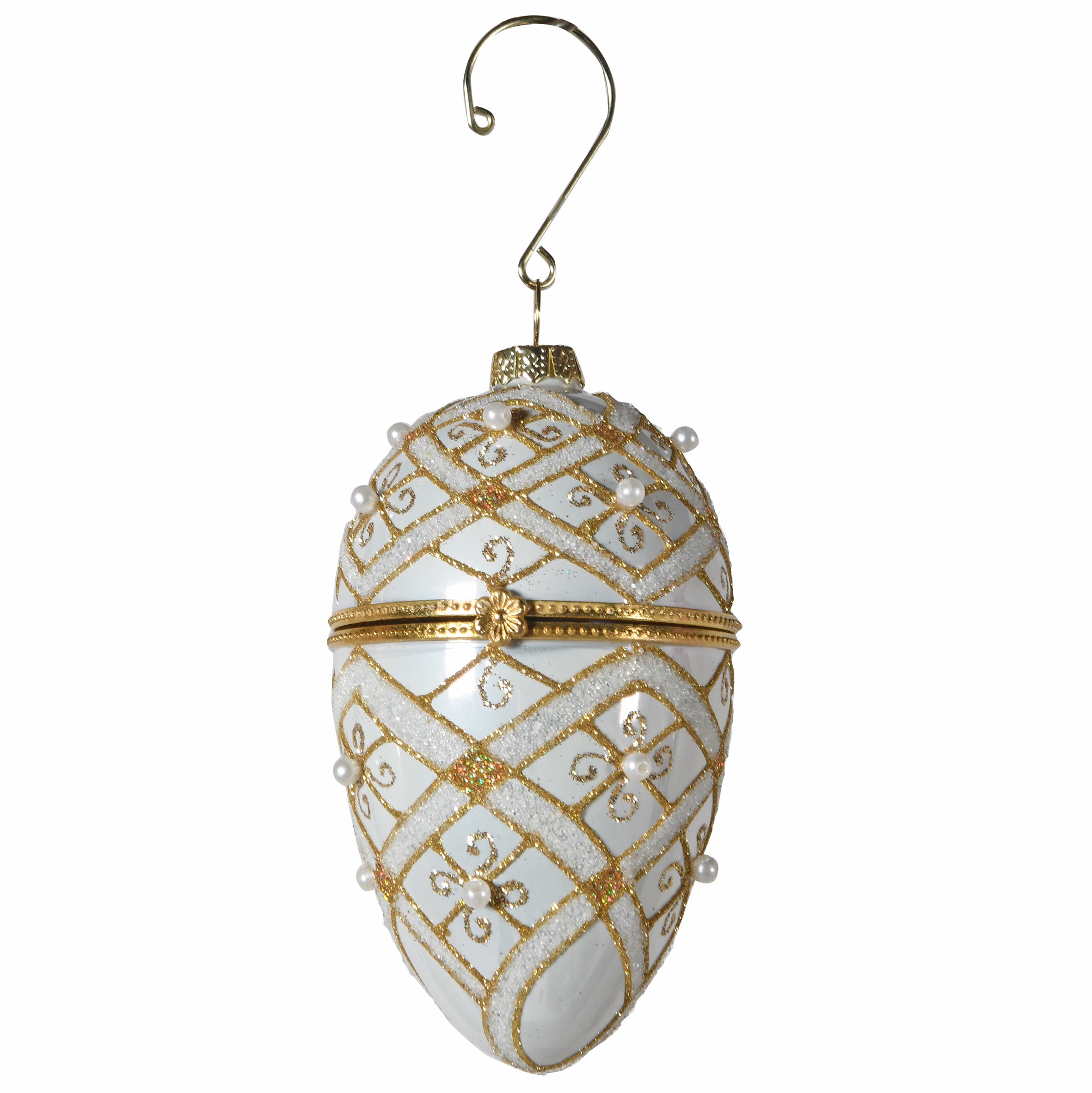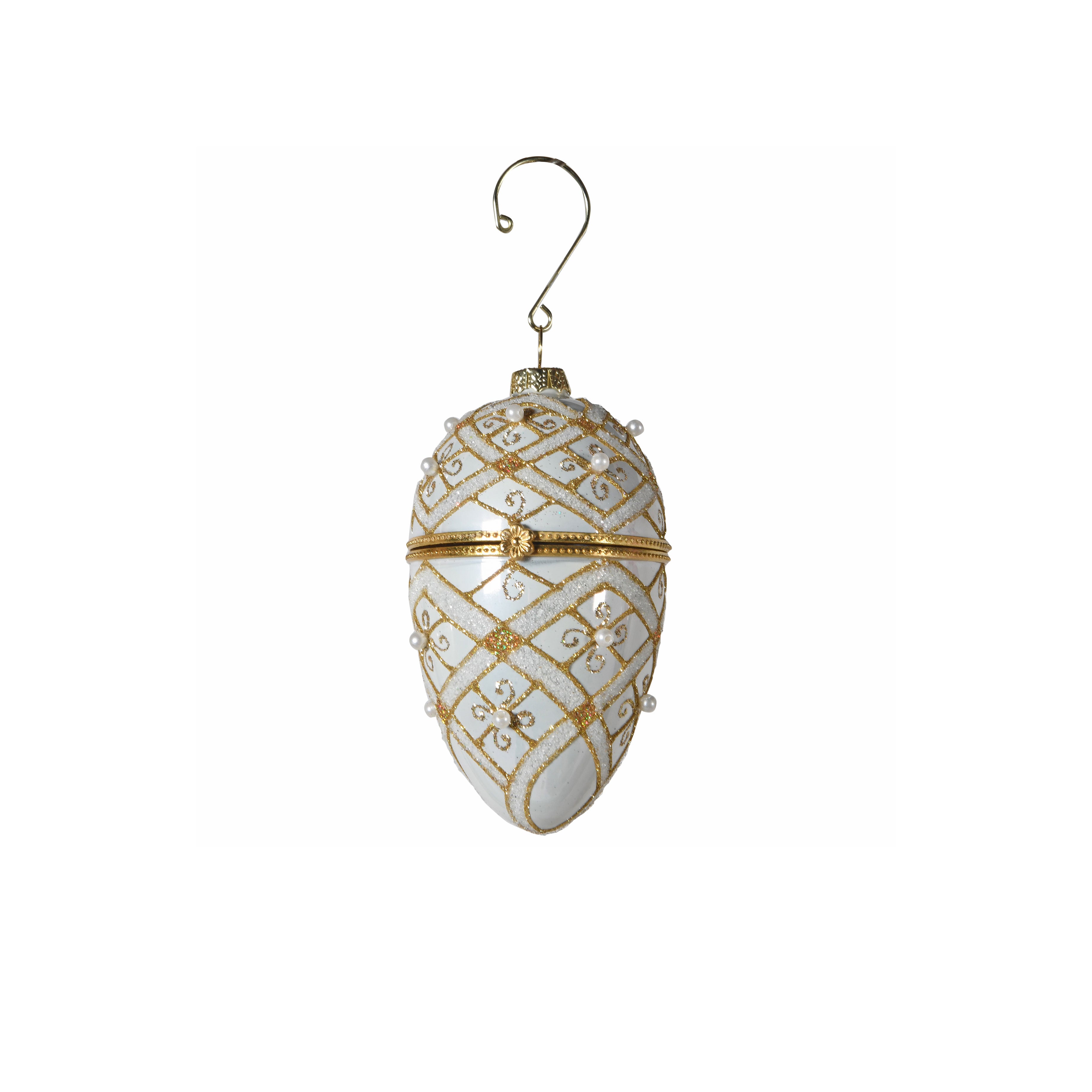 Add a touch of classic to your Christmas tree with our glam faberge bauble. Crafted from glass, it features an oval silhouette adorned in ornate motifs and embellished with faux pearl beads. Whether hanging on the Christmas tree or clustered by its base - our decoration is fundamentally festive.