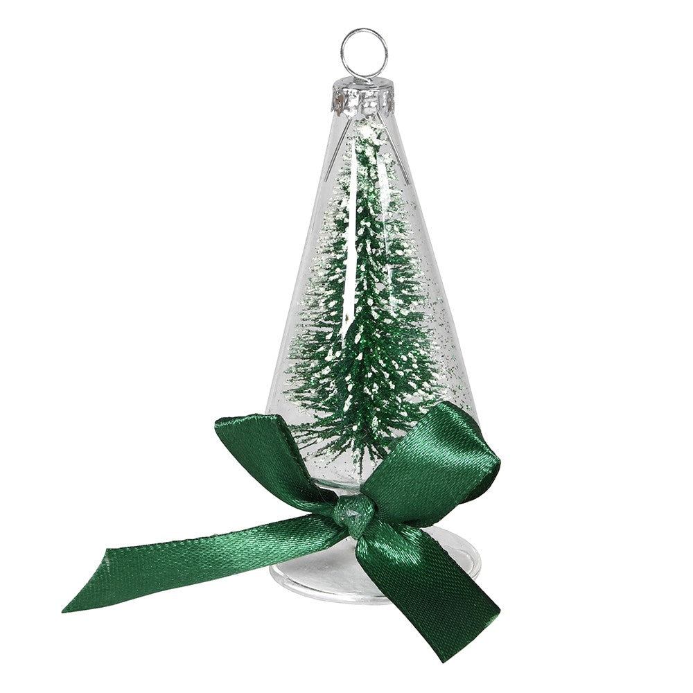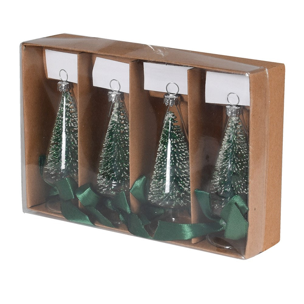Our name card holder set offers four glass bodies tied with brilliant green ribbon. Inside, intricate green trees come complete with freshly fallen snow on their tips.