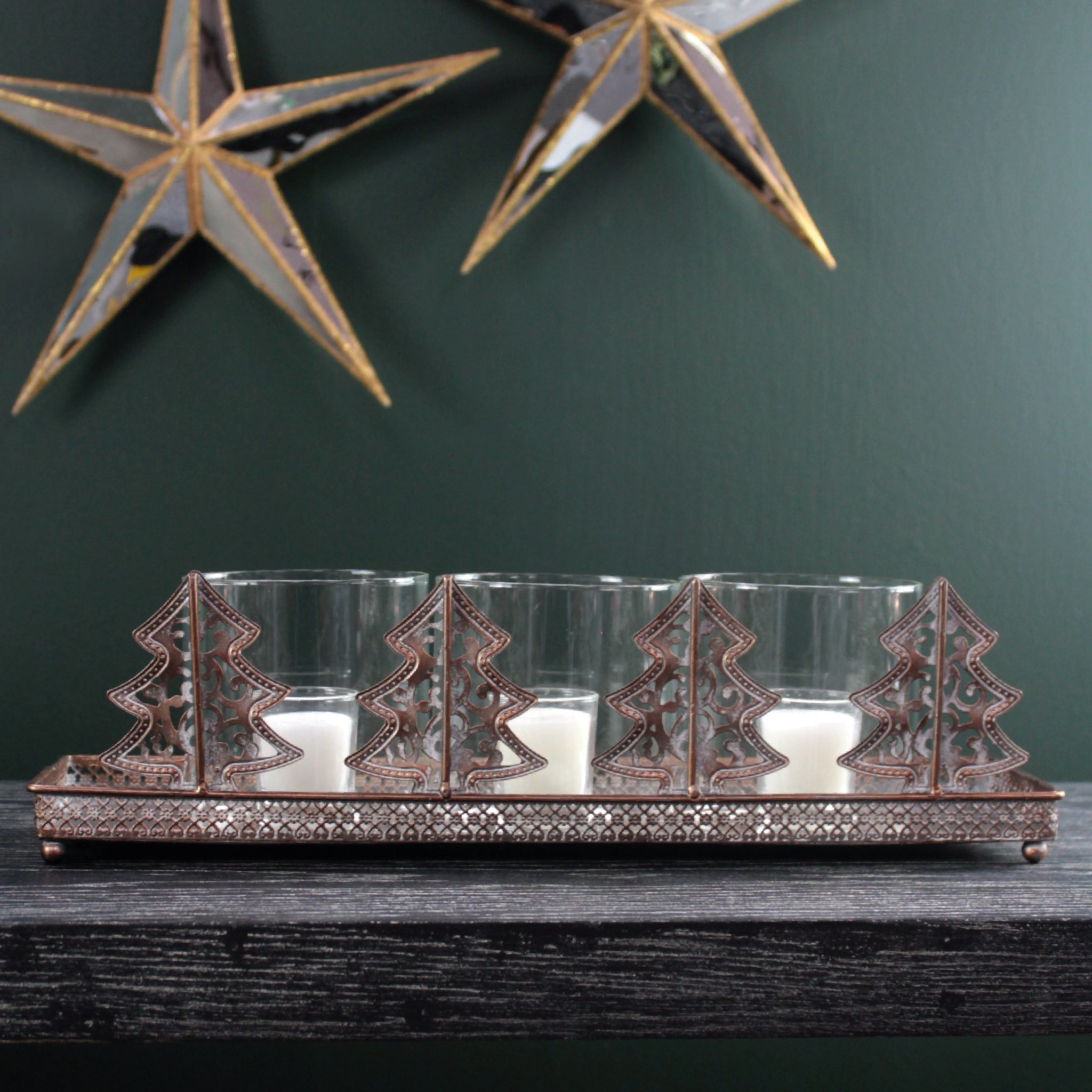 Our triple candle holder is crafted in iron with an edgy distressed copper finish. Featuring a trio of glasses lined with four iron trees at their back - it's a decoration fit for the season.