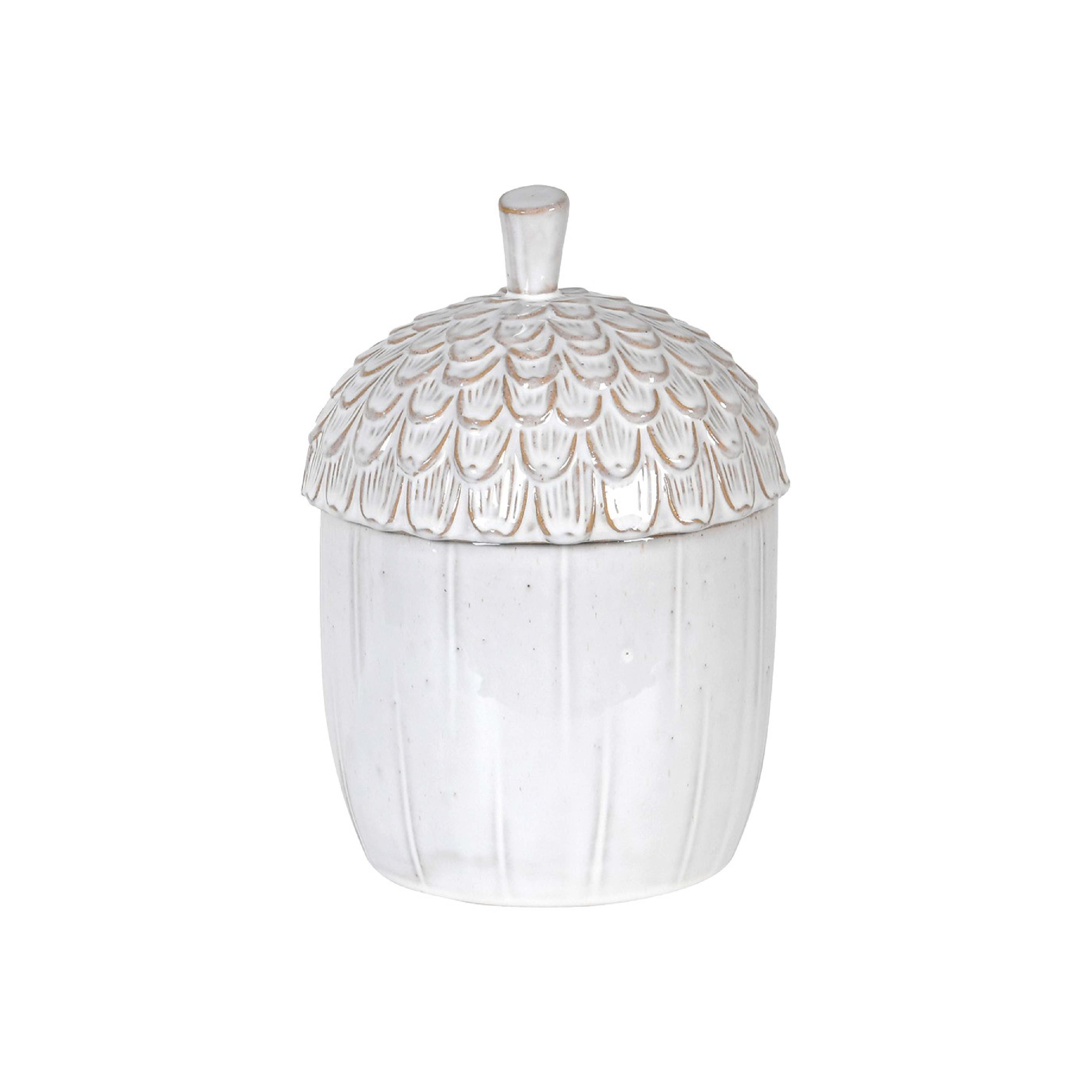 Our decorative storage jar combines the classic and the contemporary. Carefully crafted from ceramic coloured white, it features a generous interior with an acorn-shaped lid. Boasting rustic details inspired by antique-style ornaments, and complete with a high-gloss finish - whether stashing sweets or making its statement solo; our jar offers winter-inspired accent year round.