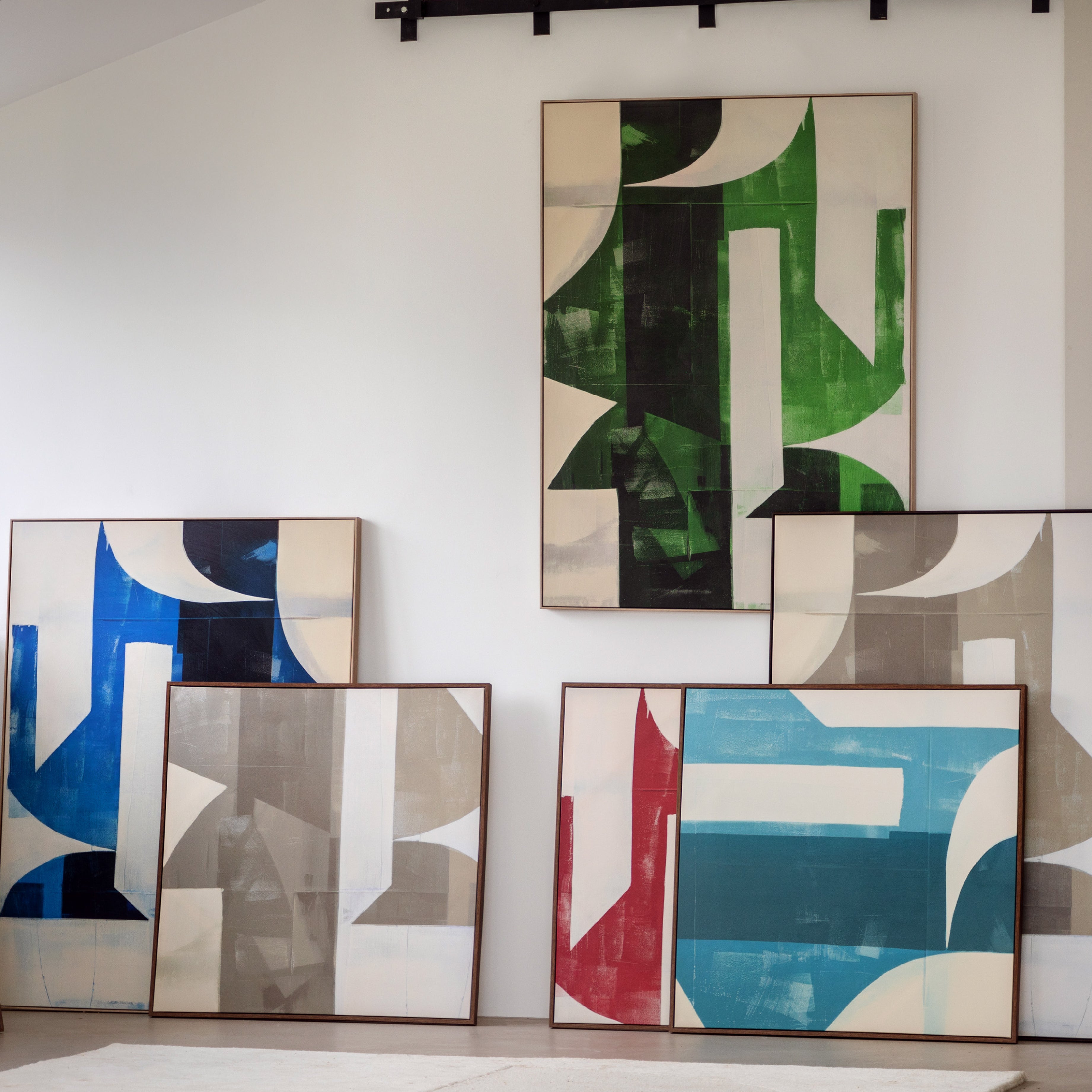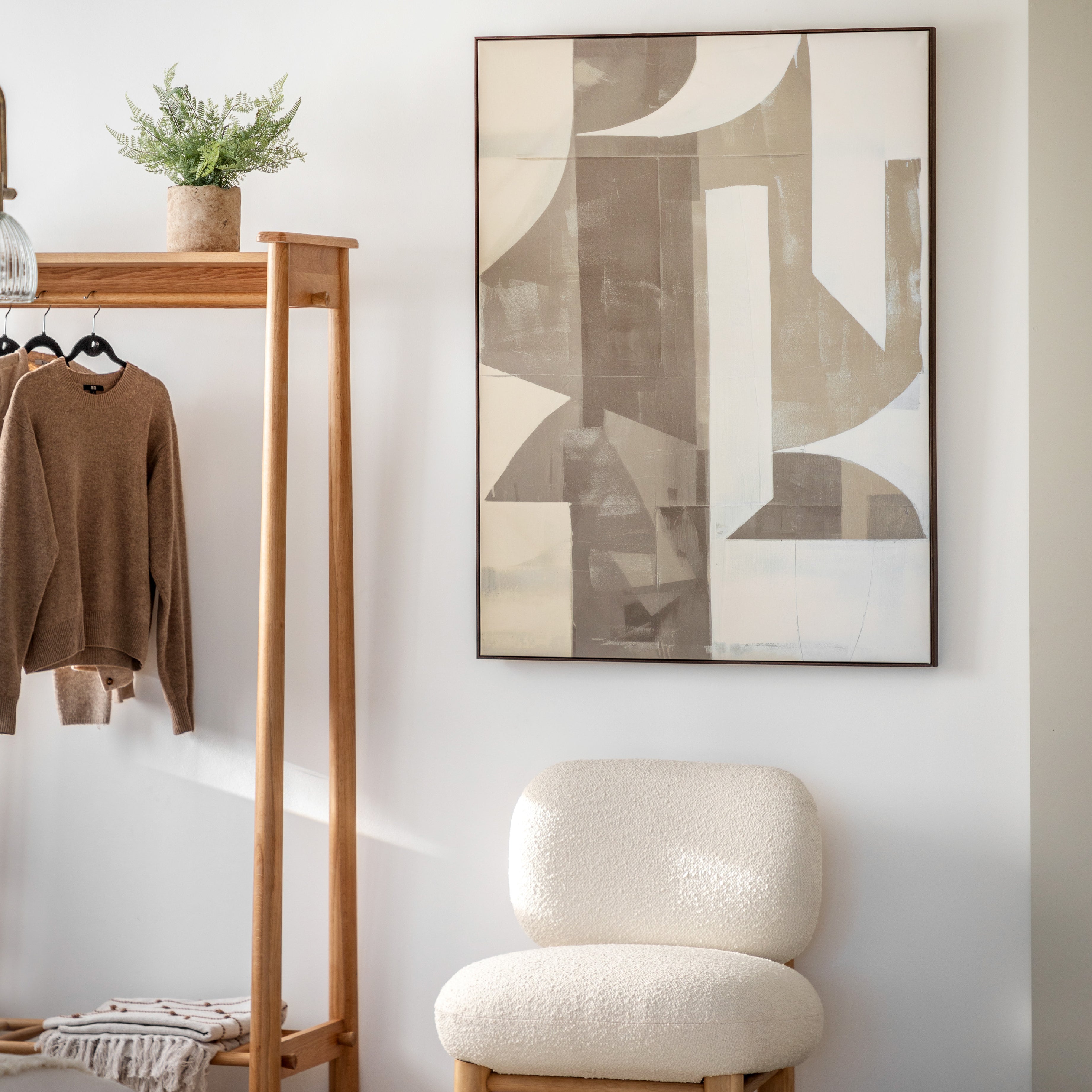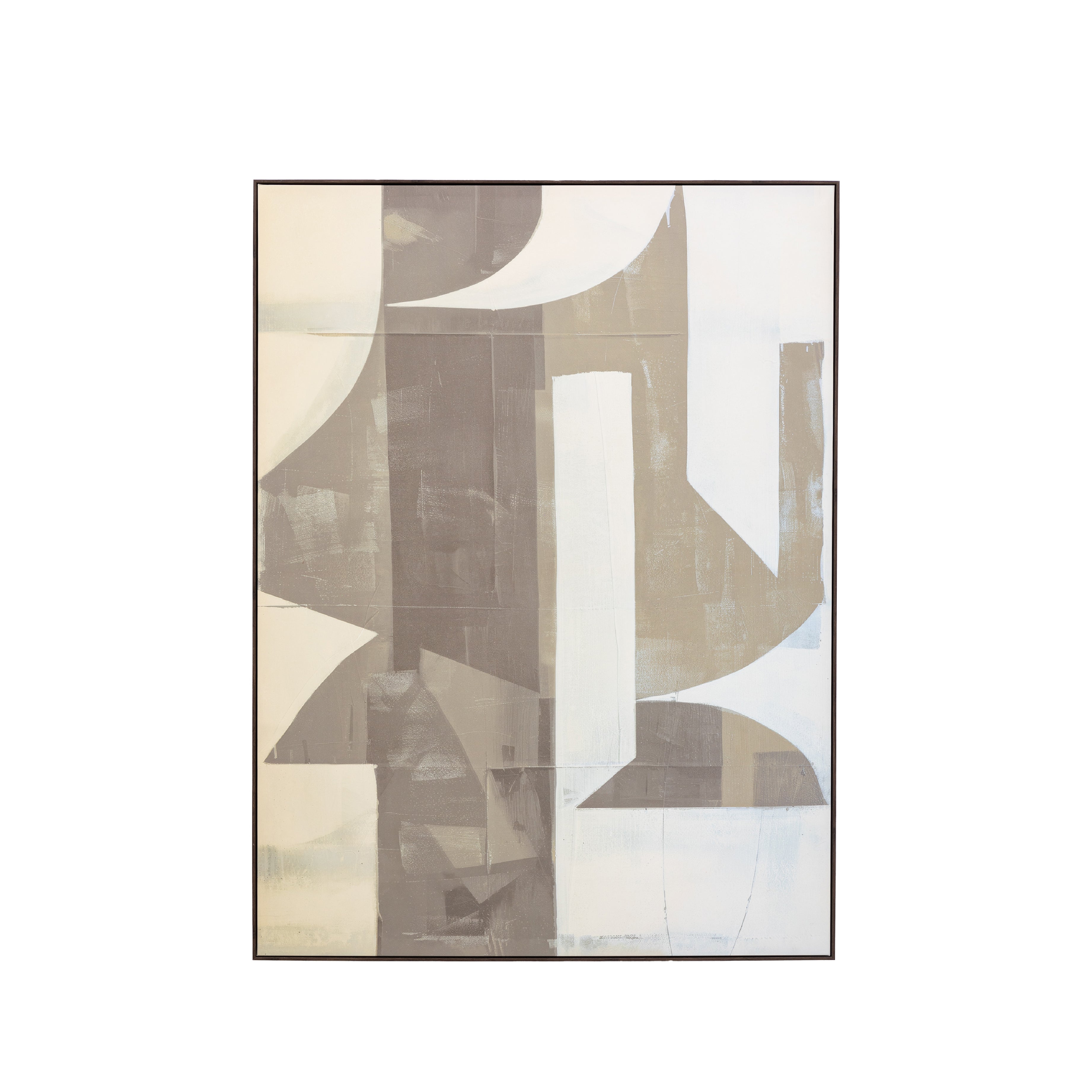 Make a bold statement with this captivating piece, featuring a dynamic composition of abstract shapes and a sophisticated neutral palette, creating a visually engaging focal point for any room.