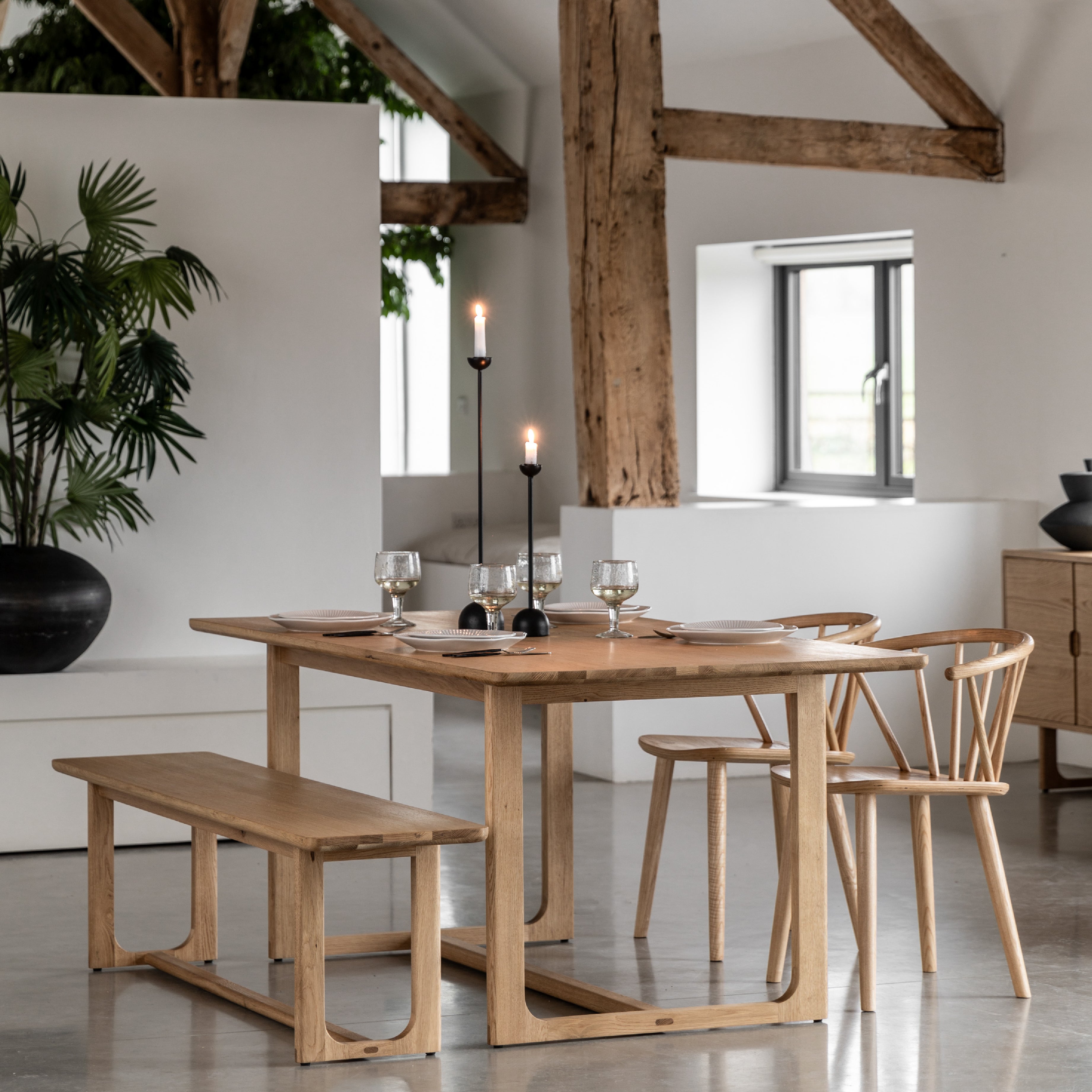 Crafted from the finest oak and structural oak veneers where practical, this stunning dining table pairs perfectly with the matching dining bench or chairs. The table offers elegant design, with its simple top and beautifully shaped underframe. The wood has a lovely natural finish.