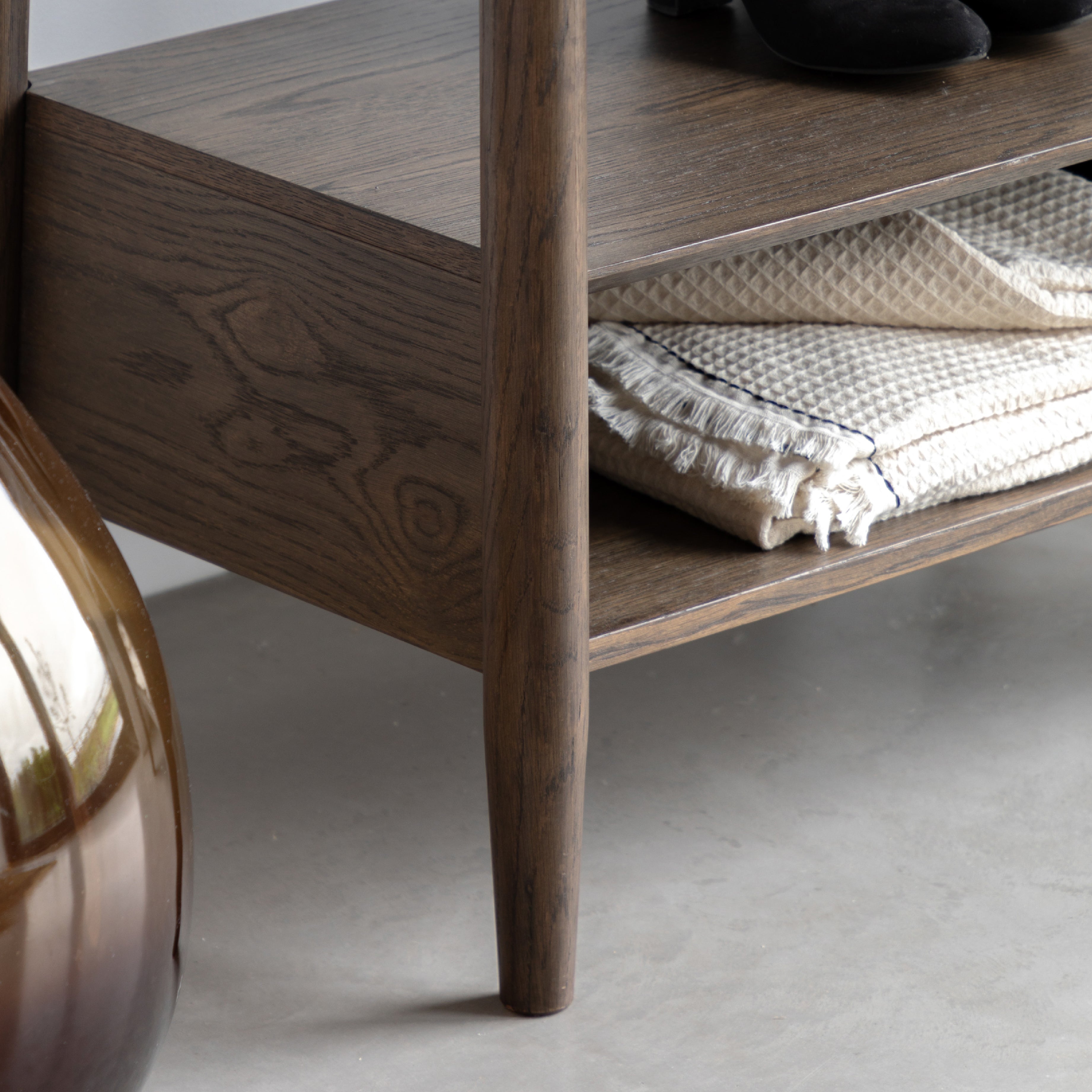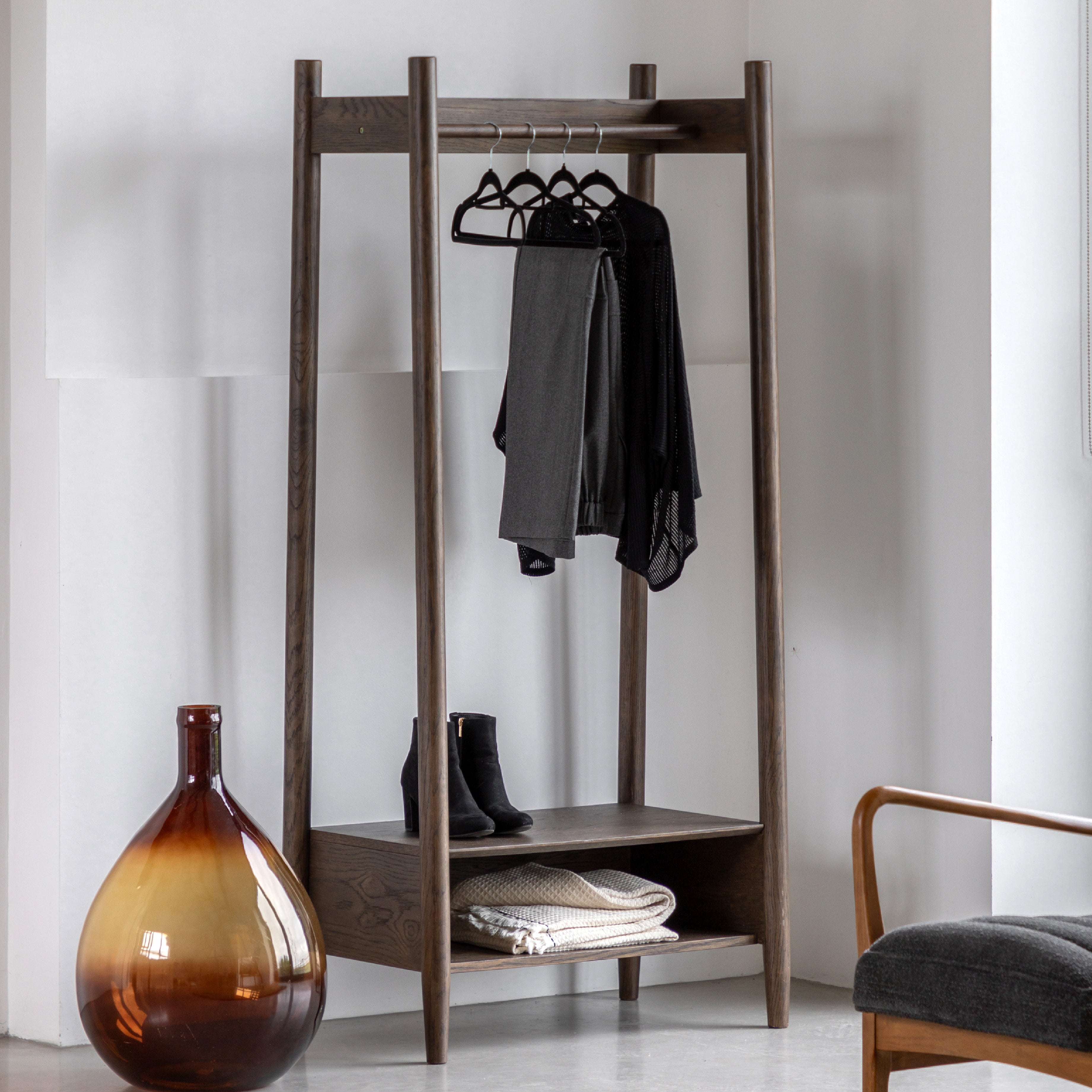 This open wardrobe is a stylish and functional addition to any bedroom. Its minimalist design and oak construction create a sleek and modern look and the smoked finish creates a warm and inviting feel. The sturdy frame and spacious shelf provide ample space for hanging coats, hats, and bags. Perfect for keeping any space tidy and organised.