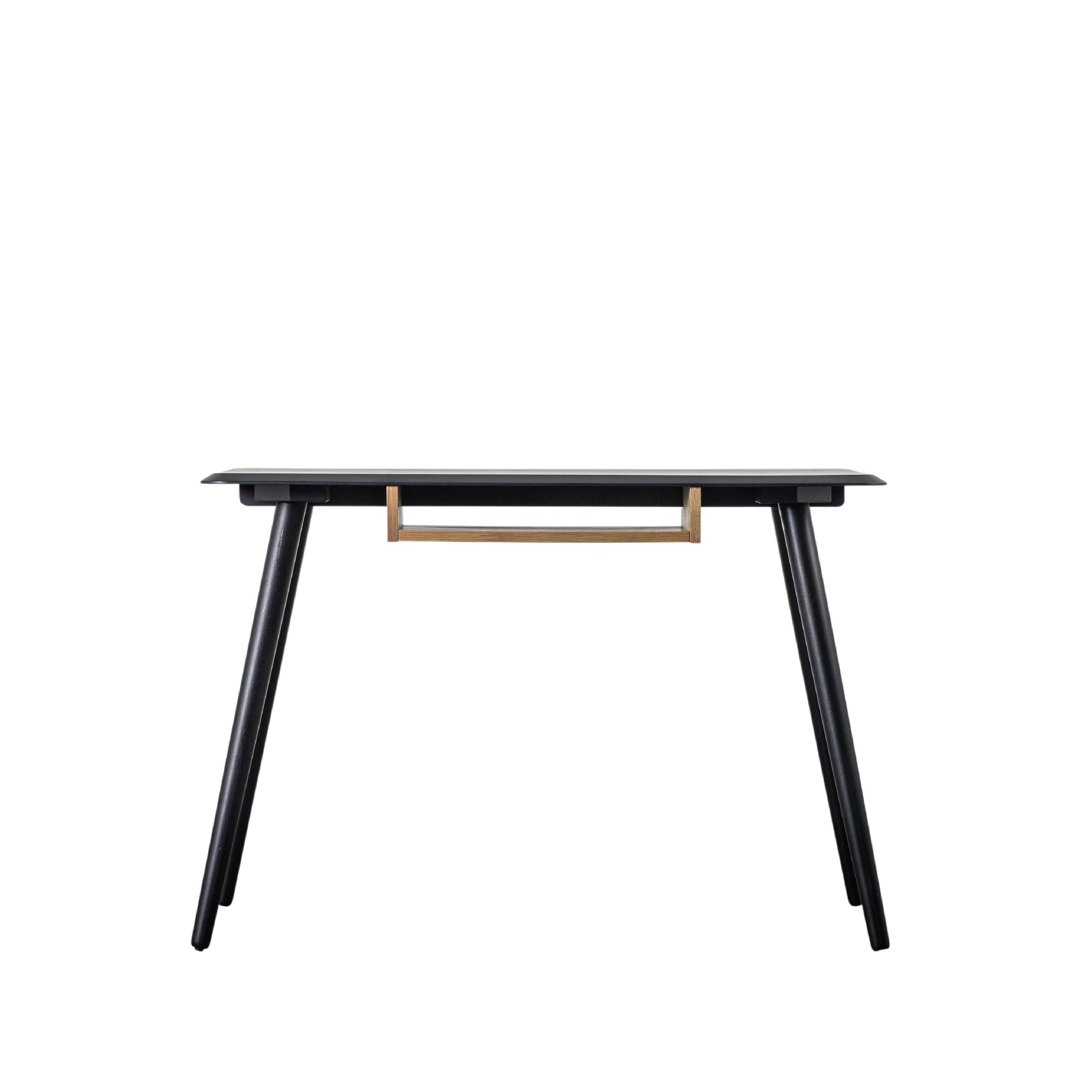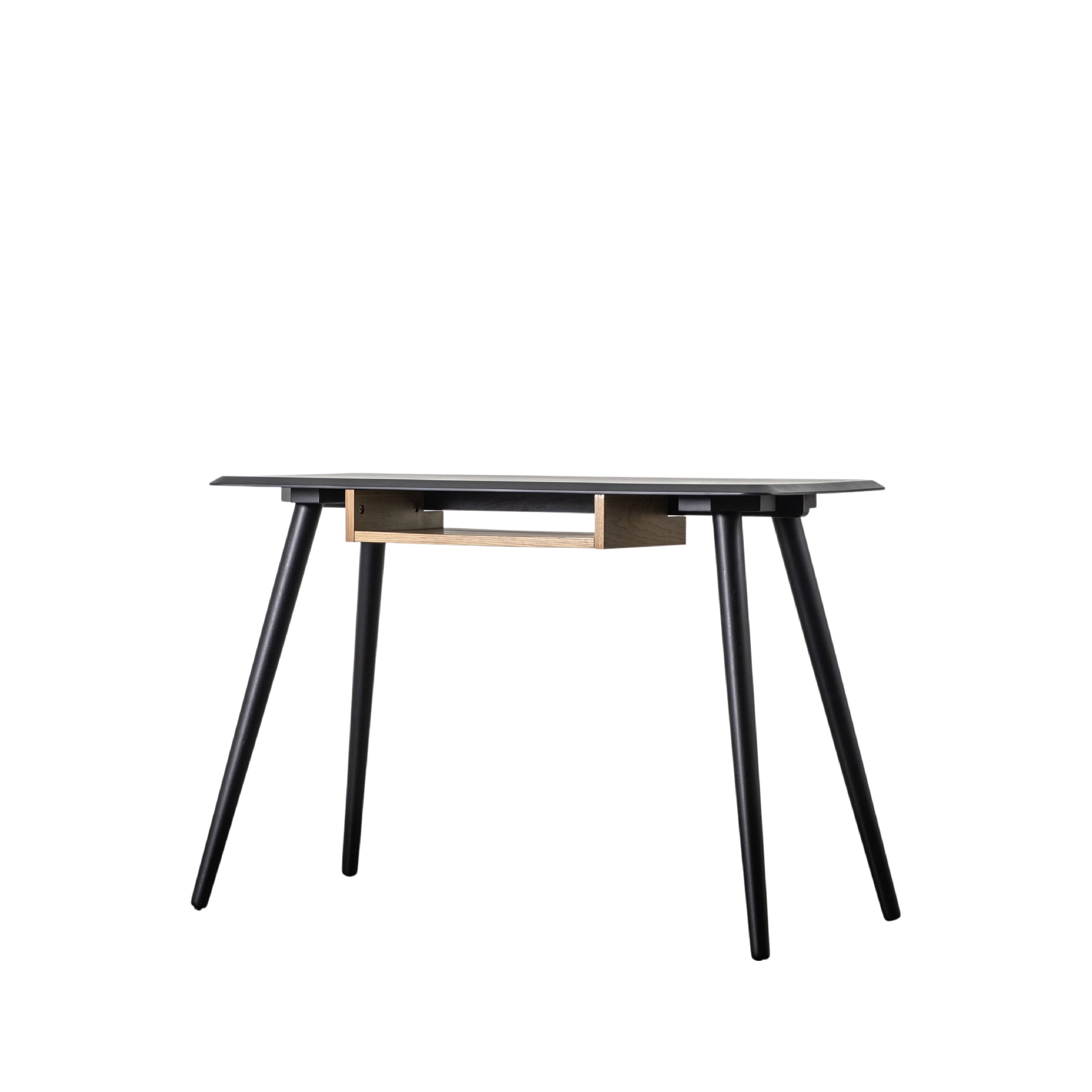 Offering a modern twist on mid-century style, this lovely desk features solid timber legs in a black finish paired with a black oak veneer top and a natural oak veneer shelf to add contrast for a more contemporary look.