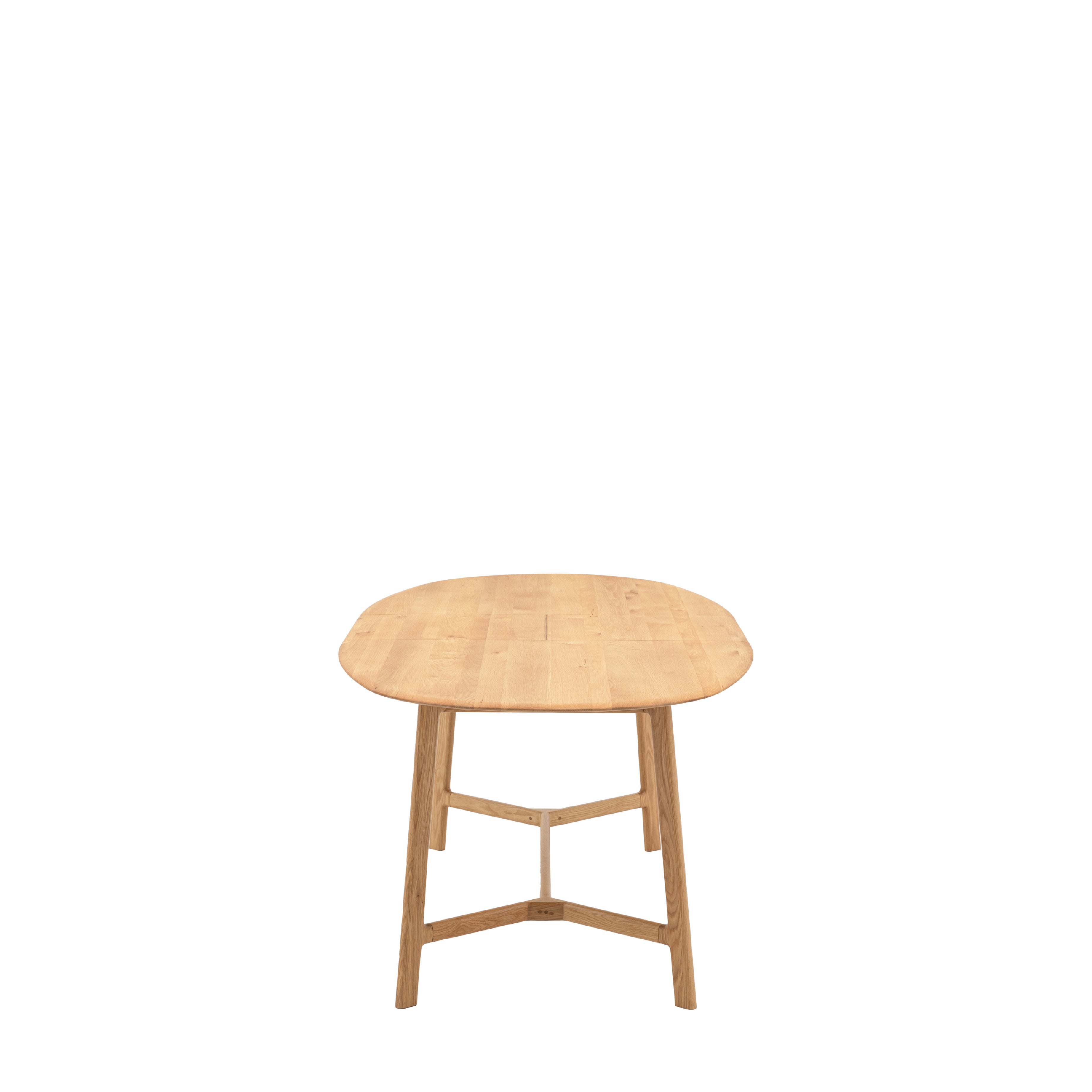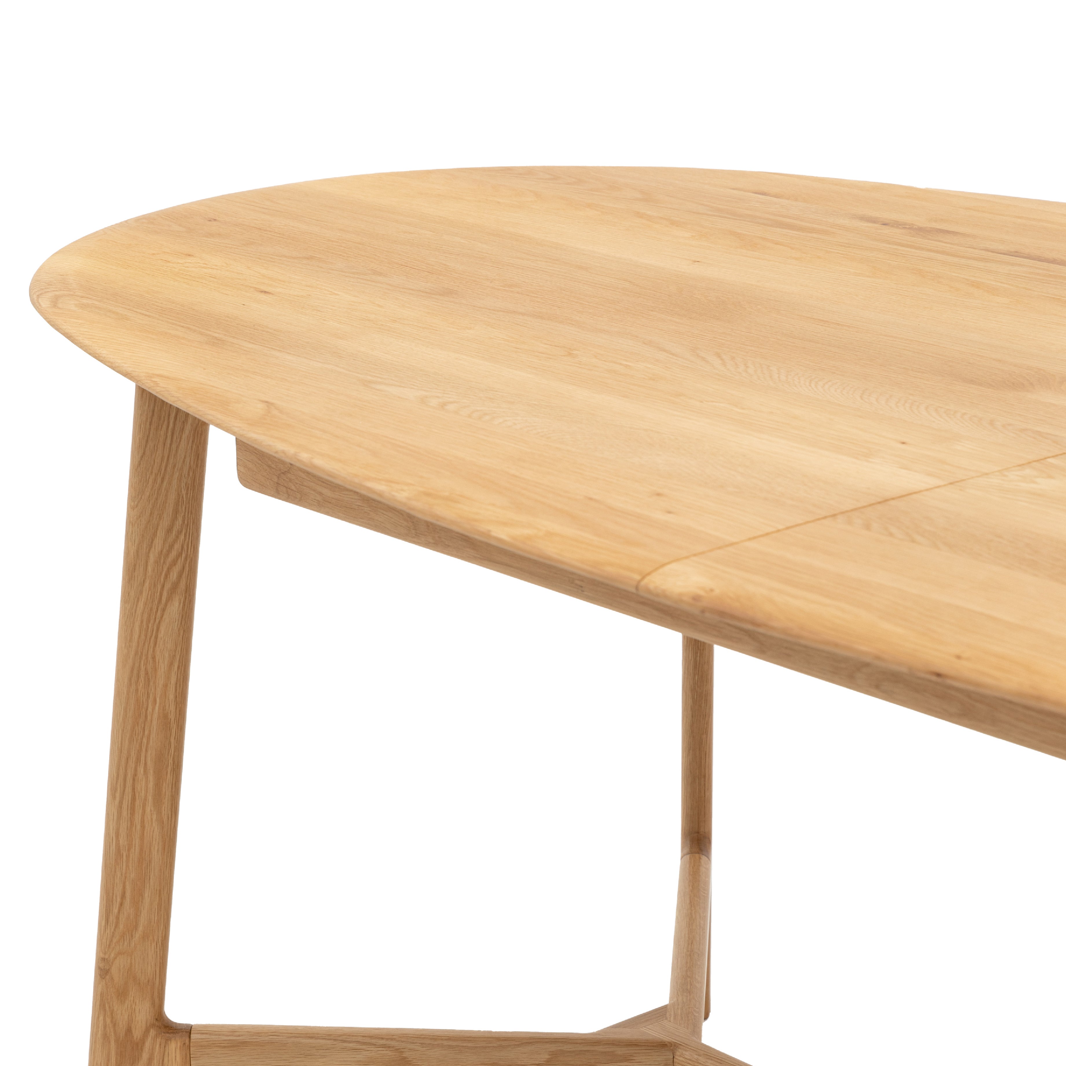 This extending dining table is a stylish and functional addition to any dining space. Its oval shape creates a modern and inviting look. The table can be easily extended to accommodate additional guests, making it perfect for entertaining. The sleek, tapered legs add a touch of Scandinavian minimalism, while the natural wood finish complements a variety of interior styles.