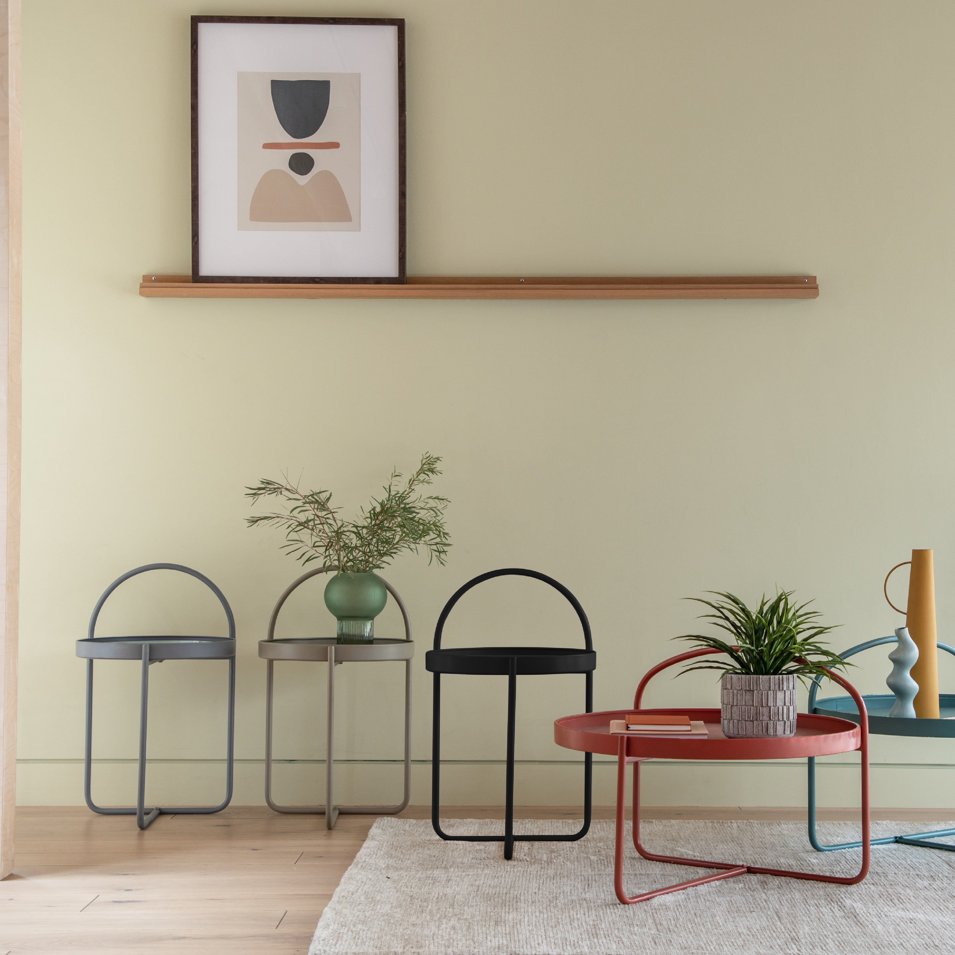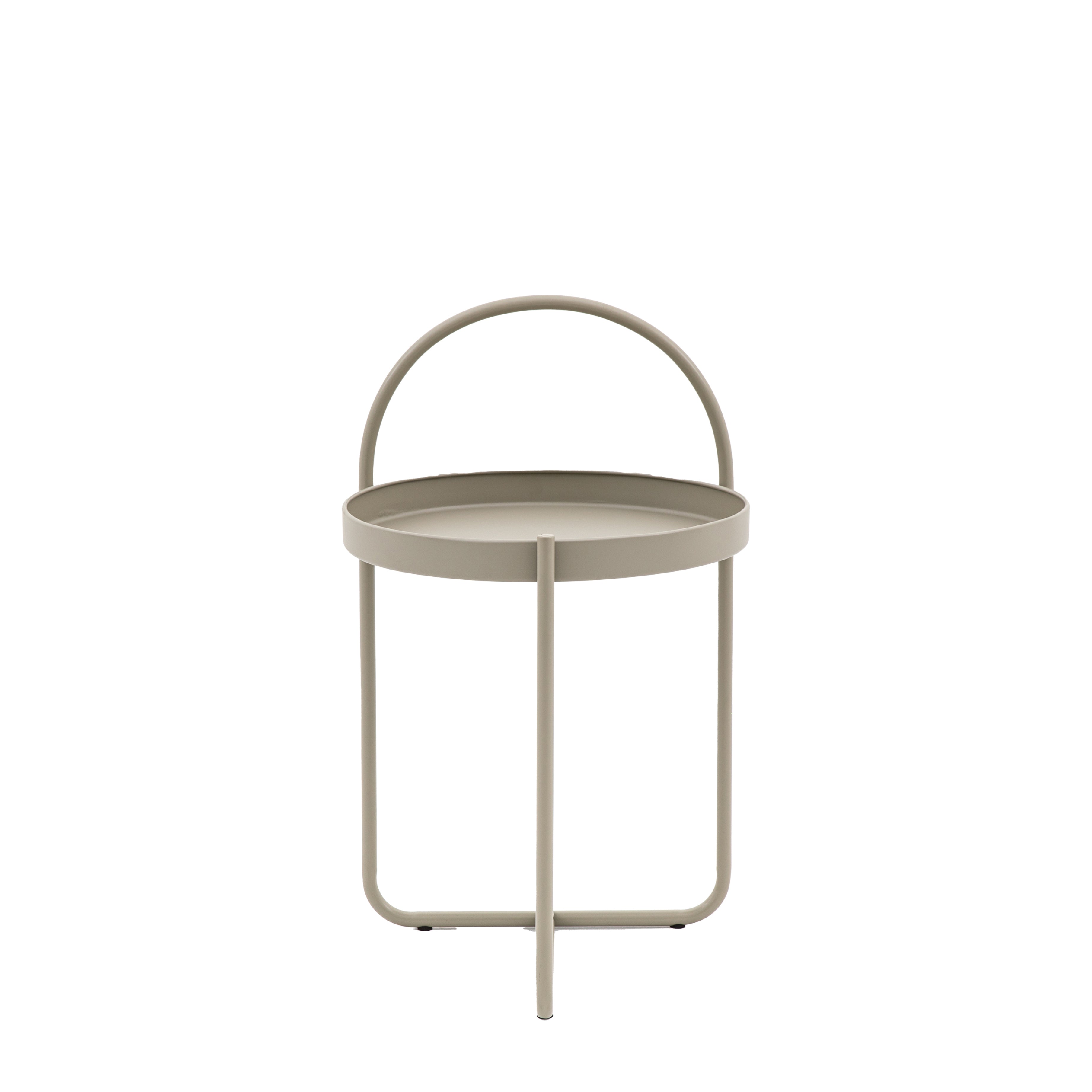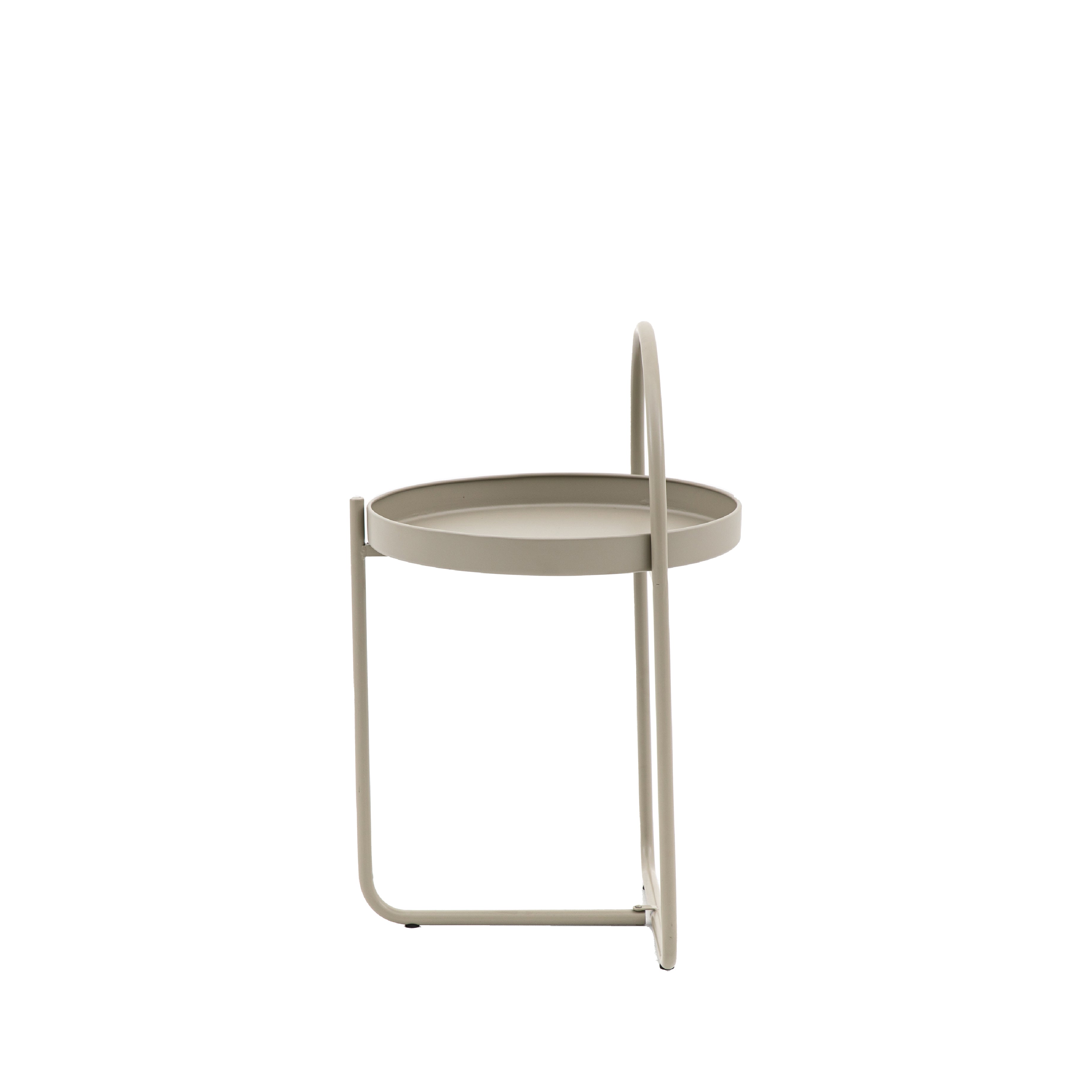 The stylish design of this unusual side table features a tray-style top, which lifts off for added practicality, and a continuation of one section of the base, up and over the table to create a 'handle' effect. Both the tray top and base are made from metal with a painted finish.