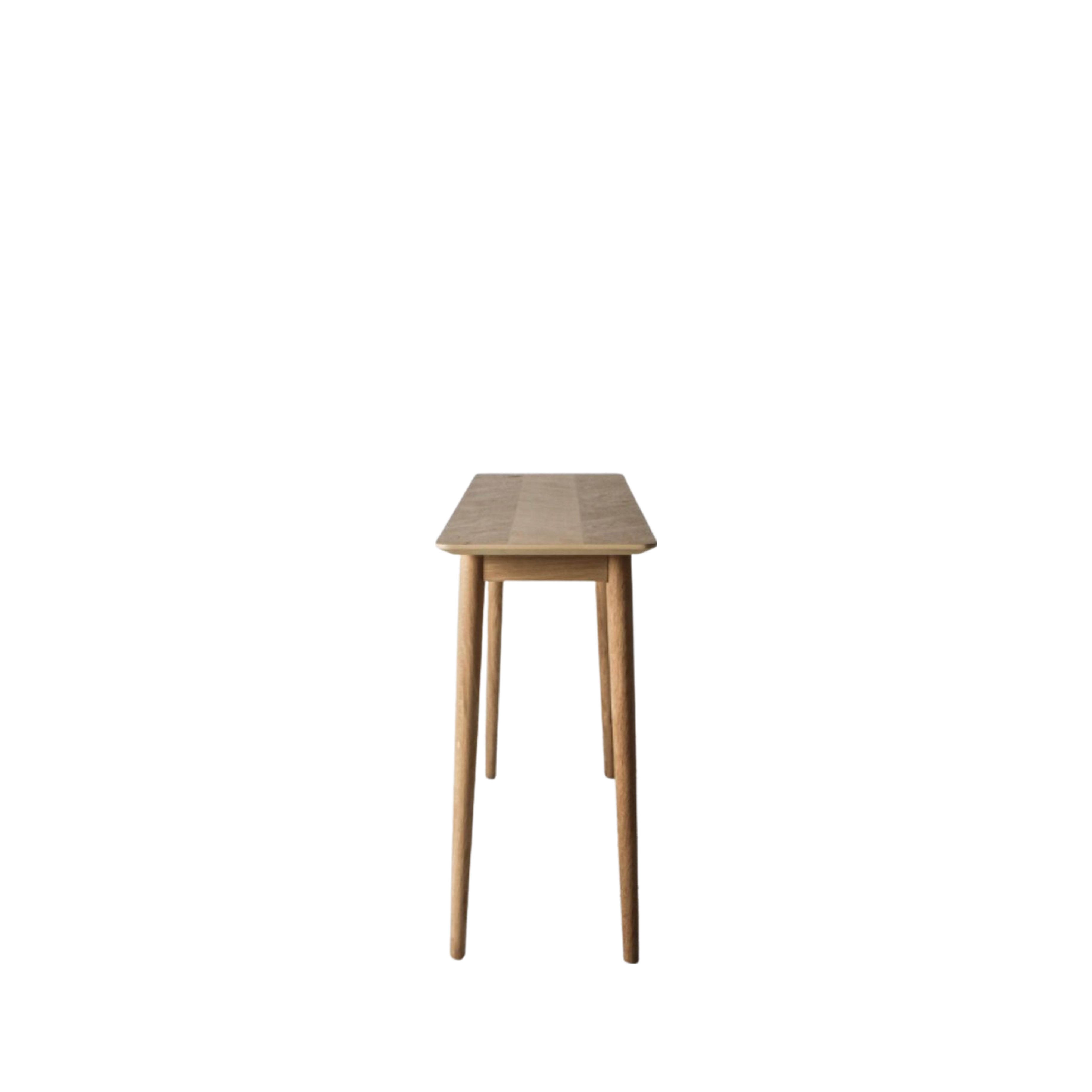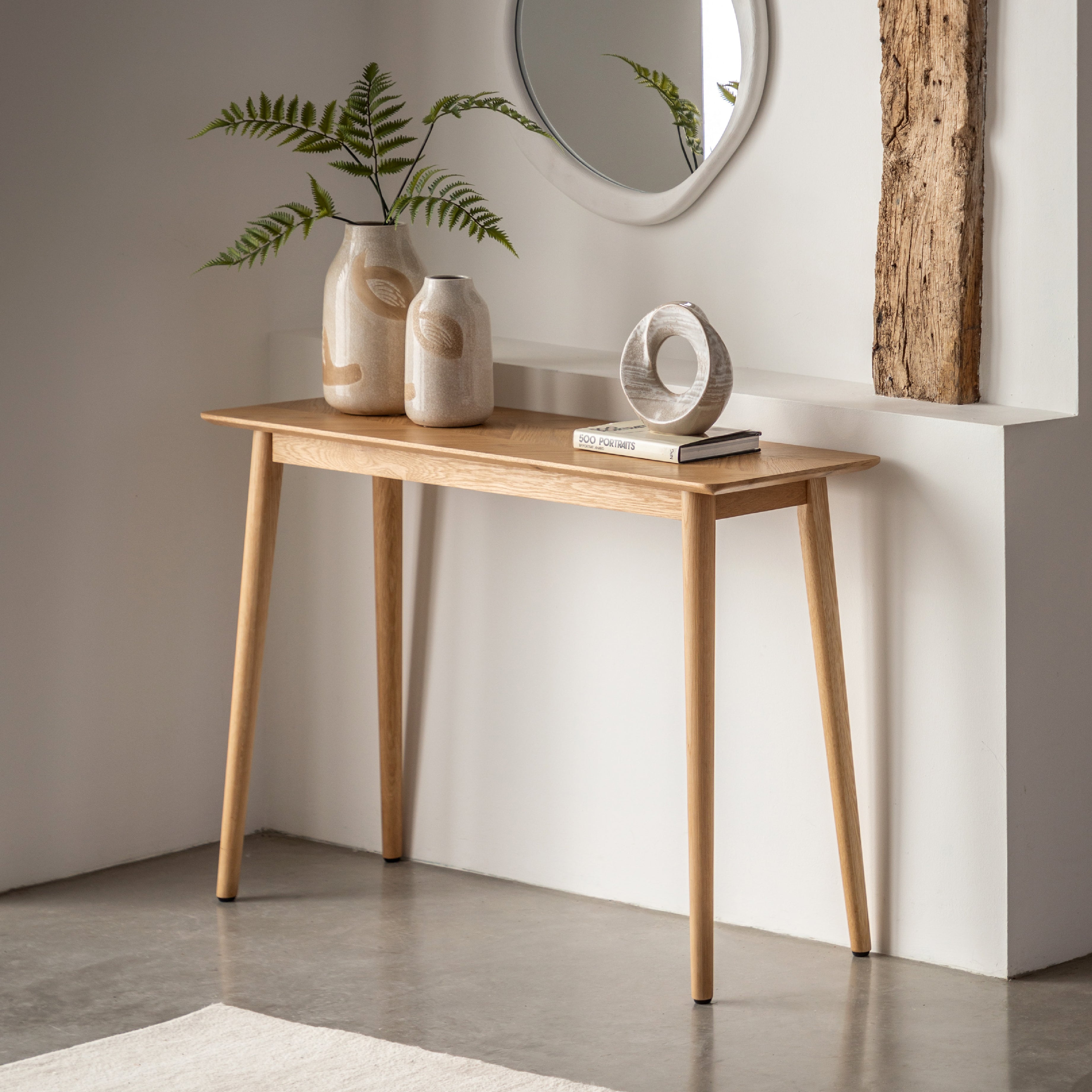This stunning console table features a beautiful inlay chevron design, and is made using European oak and rustic oak structured veneers which show the natural beauty of the oak grain and knots. Finished in a specialist mat lacquer, which keeps the timber looking natural and dry, with brushed out grain, the table is tactile to the touch and looks amazing.
