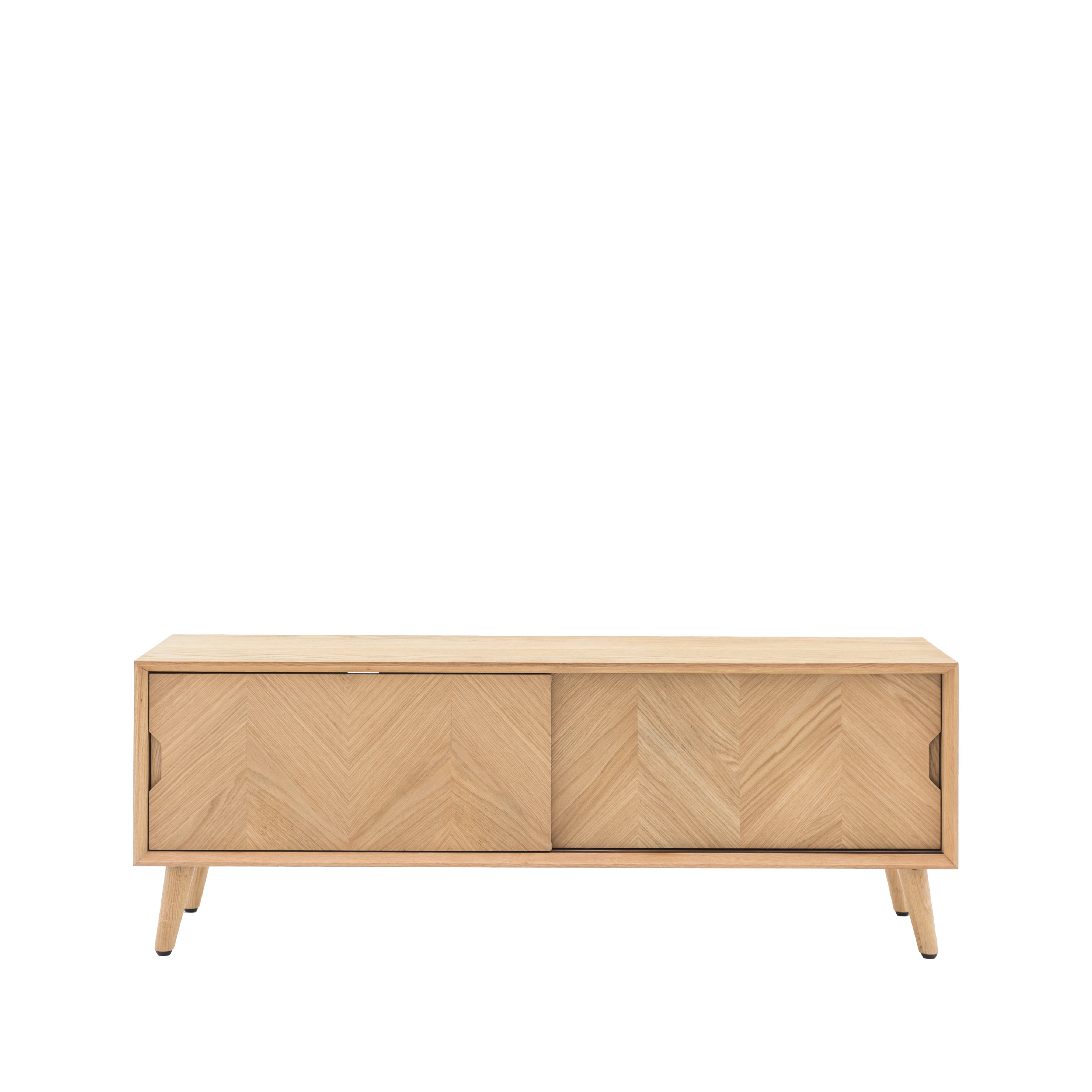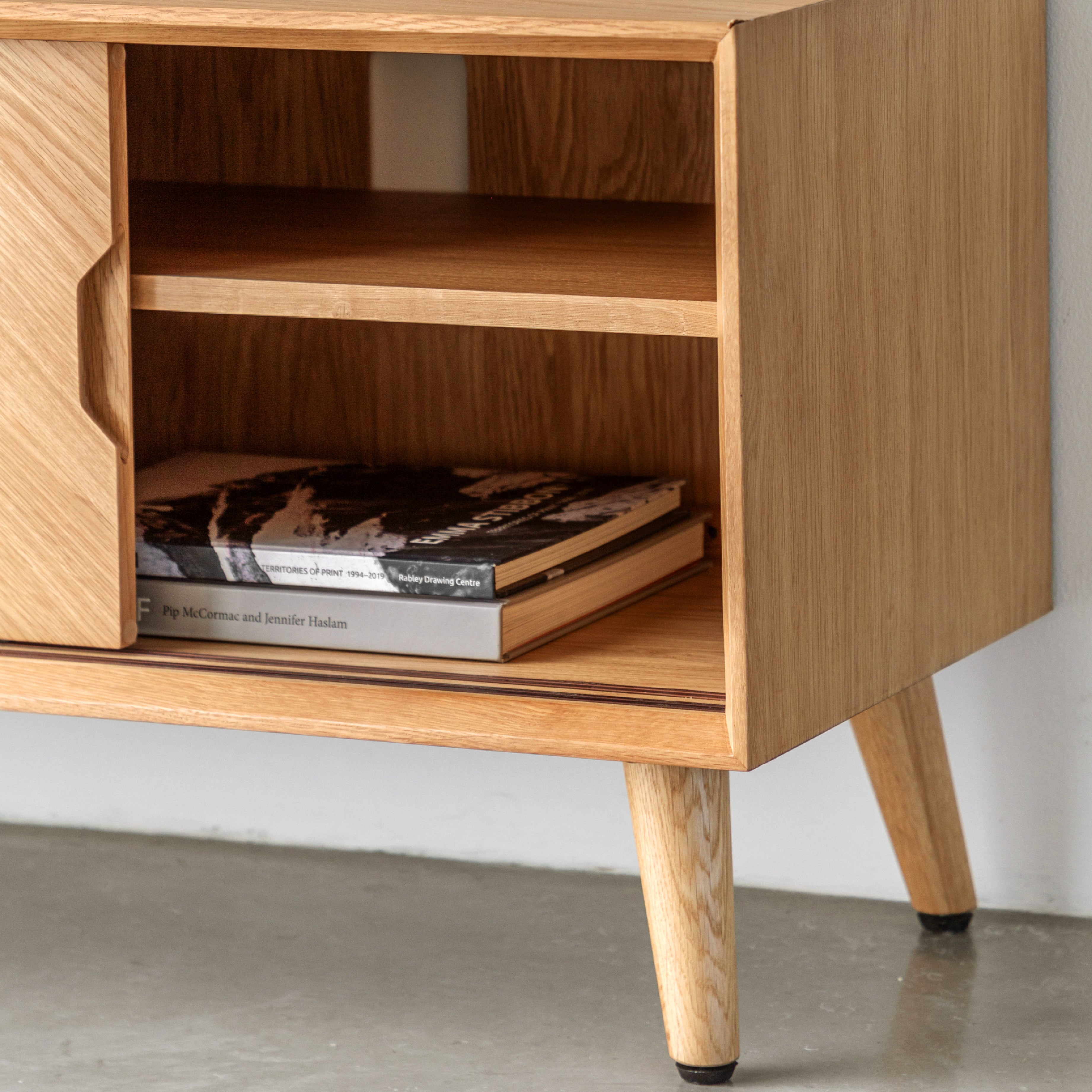 Cool and sleek this media unit features a beautiful inlay chevron design and is made using European oak and rustic oak structured veneers which show the natural beauty of the oak grain and knots. Finished in a specialist mat lacquer, which keeps the timber looking natural and dry, with brushed out grain, the media unit is tactile to touch and looks amazing. It also features two sliding doors, interior shelf and cable holes in the back.