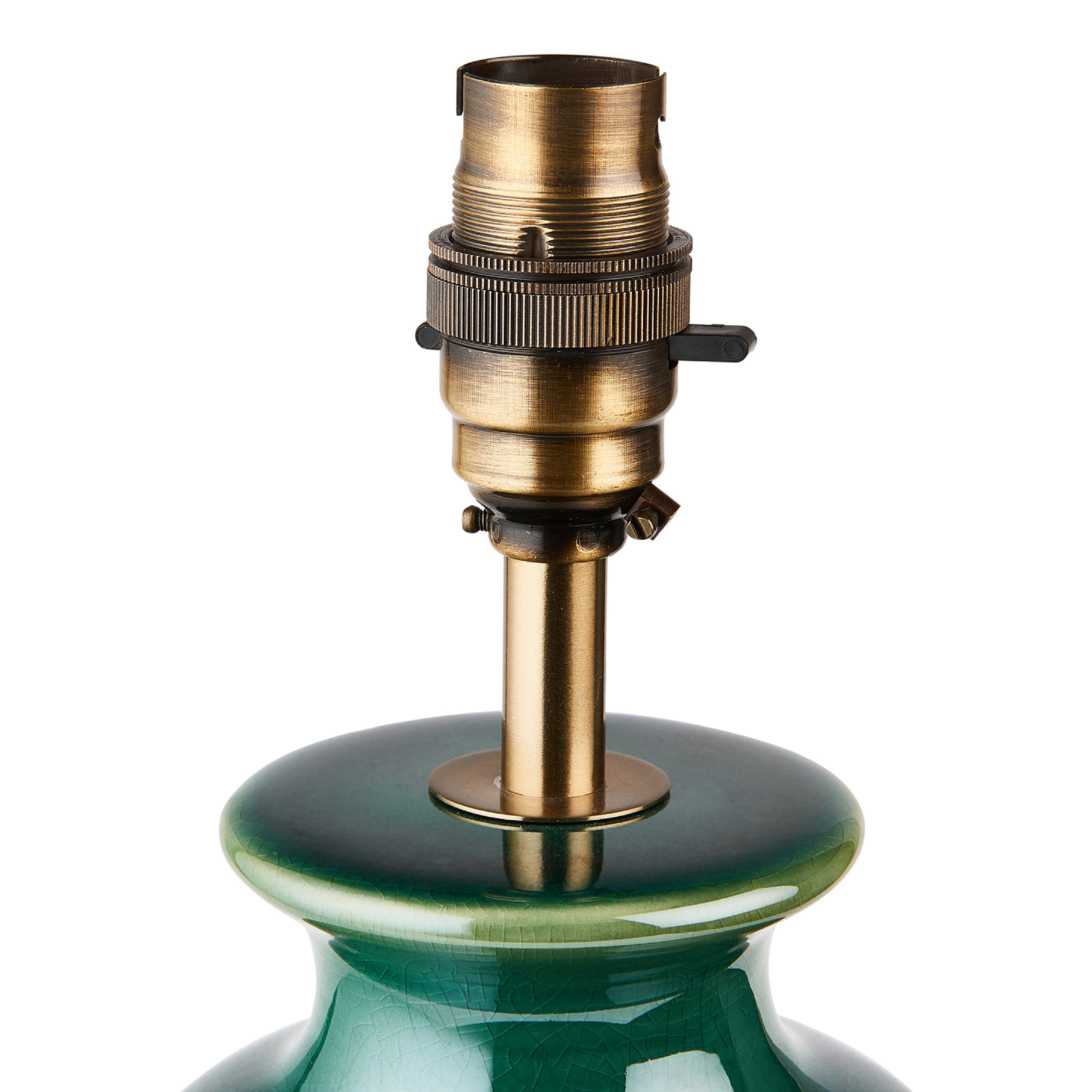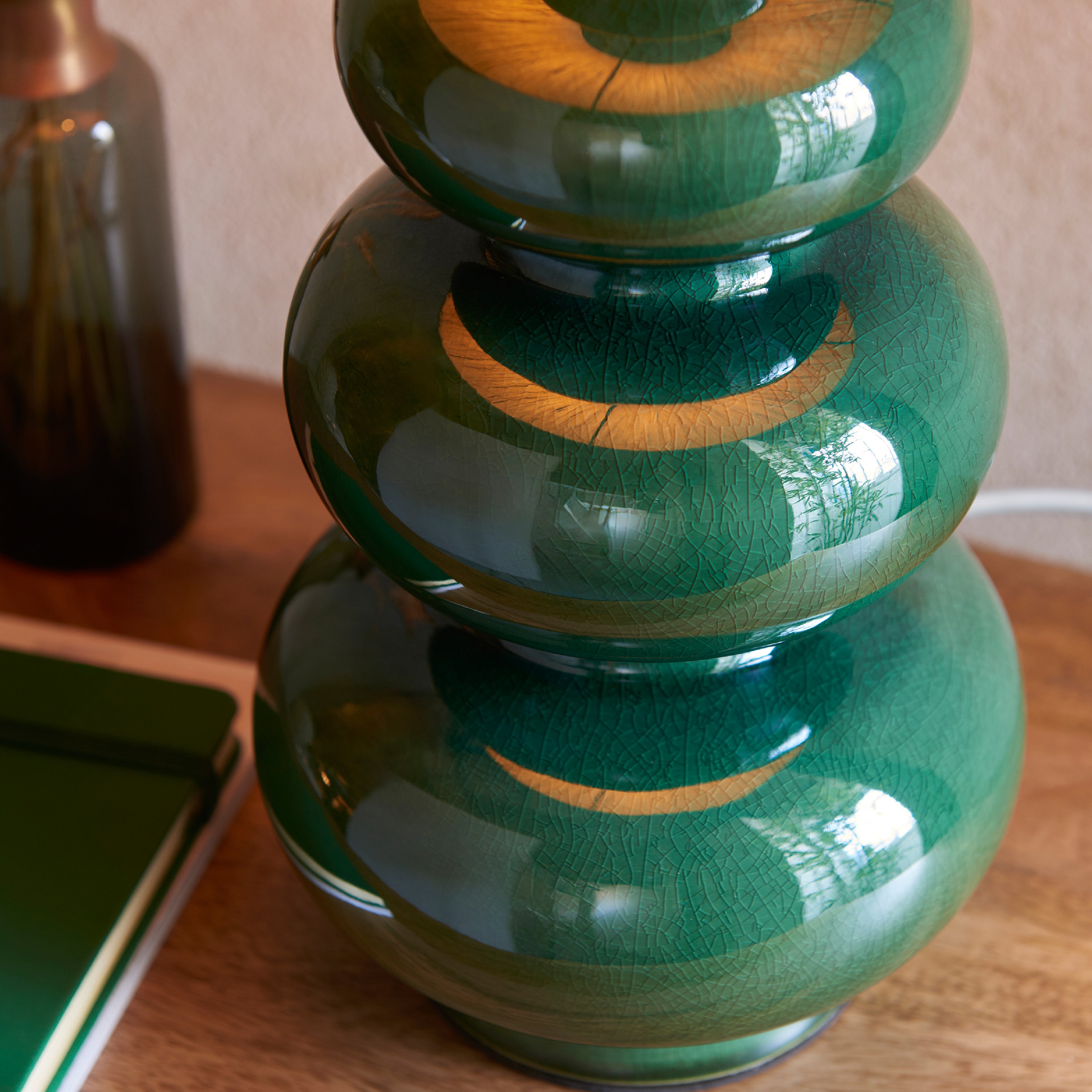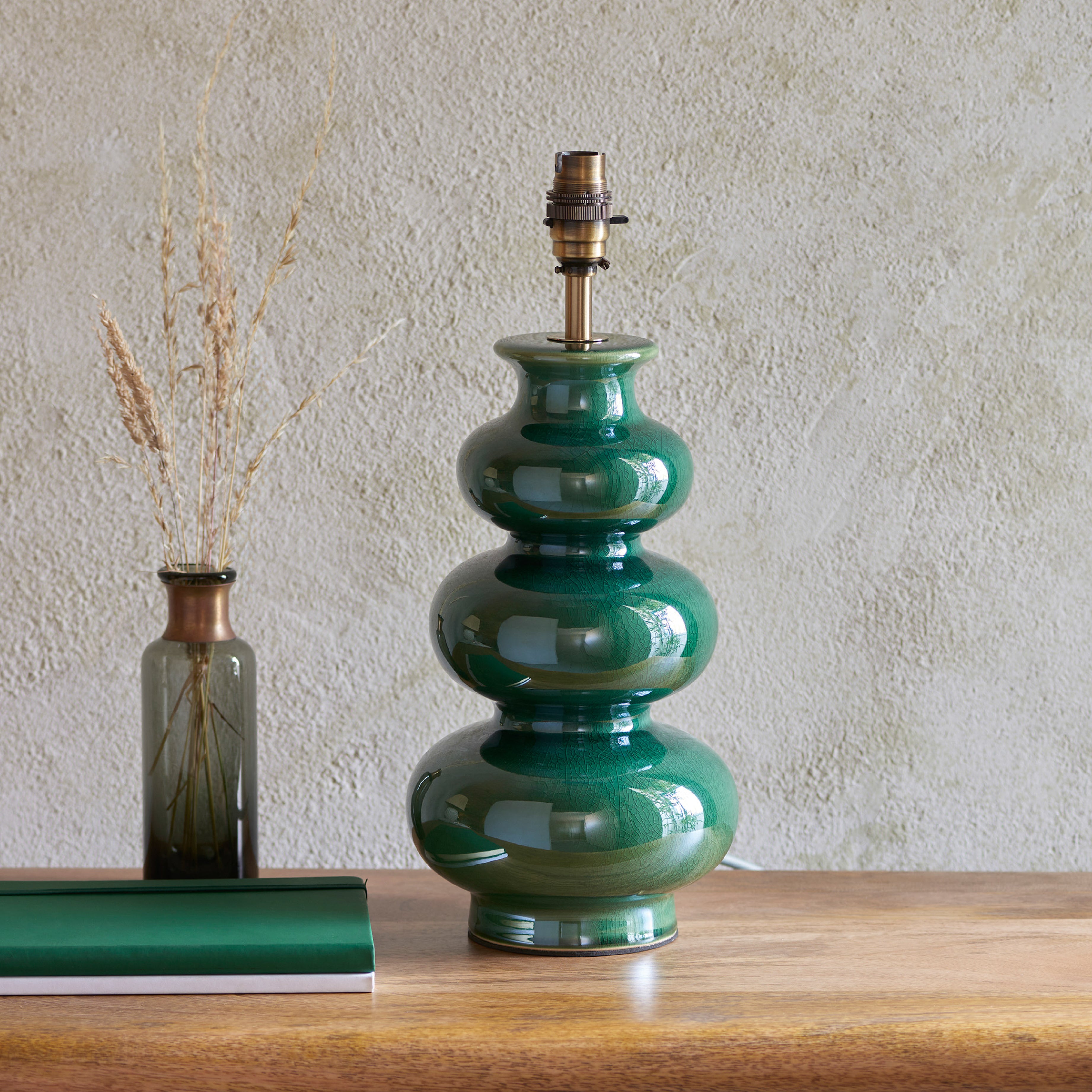 Inspired by the delicate curves of gourds from the past with a shape perfectly scaled to suit bedrooms and lounge interiors. The handmade ceramic lamp base is finished in a beautiful gloss green reactive glaze, making each piece unique. With brushed aged brass B22 switched lamp holder and grey braided flex. Pair with one of our 30cm decorative fabric or raffia shades to complete the look.