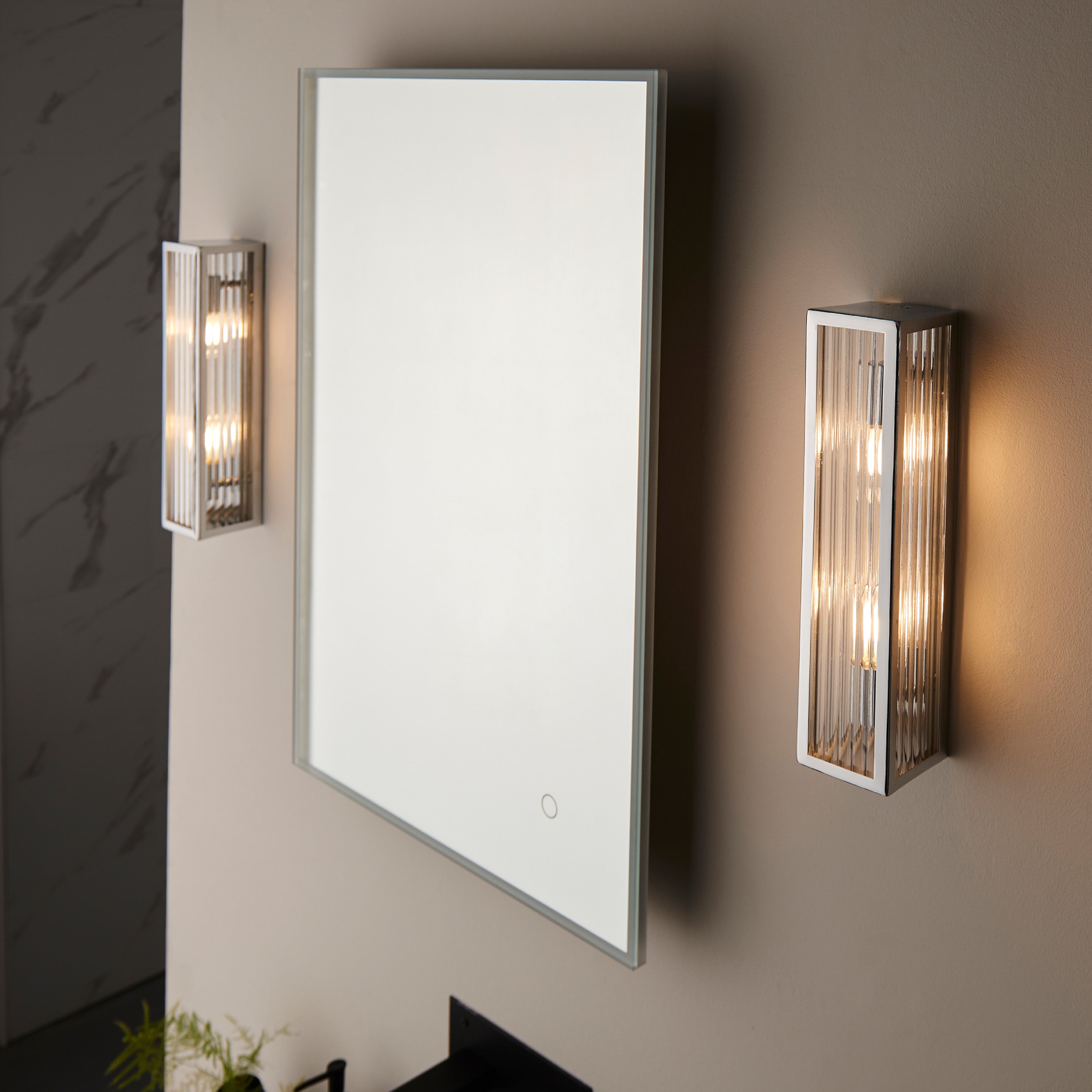 Chrome plated bathroom wall light with a contemporary clear ribbed glass diffuser design. This attractive wall light has 2 lamp fixtures, perfect for use with G9 LED lamps. IP44 rated for safe bathroom use, featuring a dimmable function. Fantastically versatile for hanging portrait or landscape.