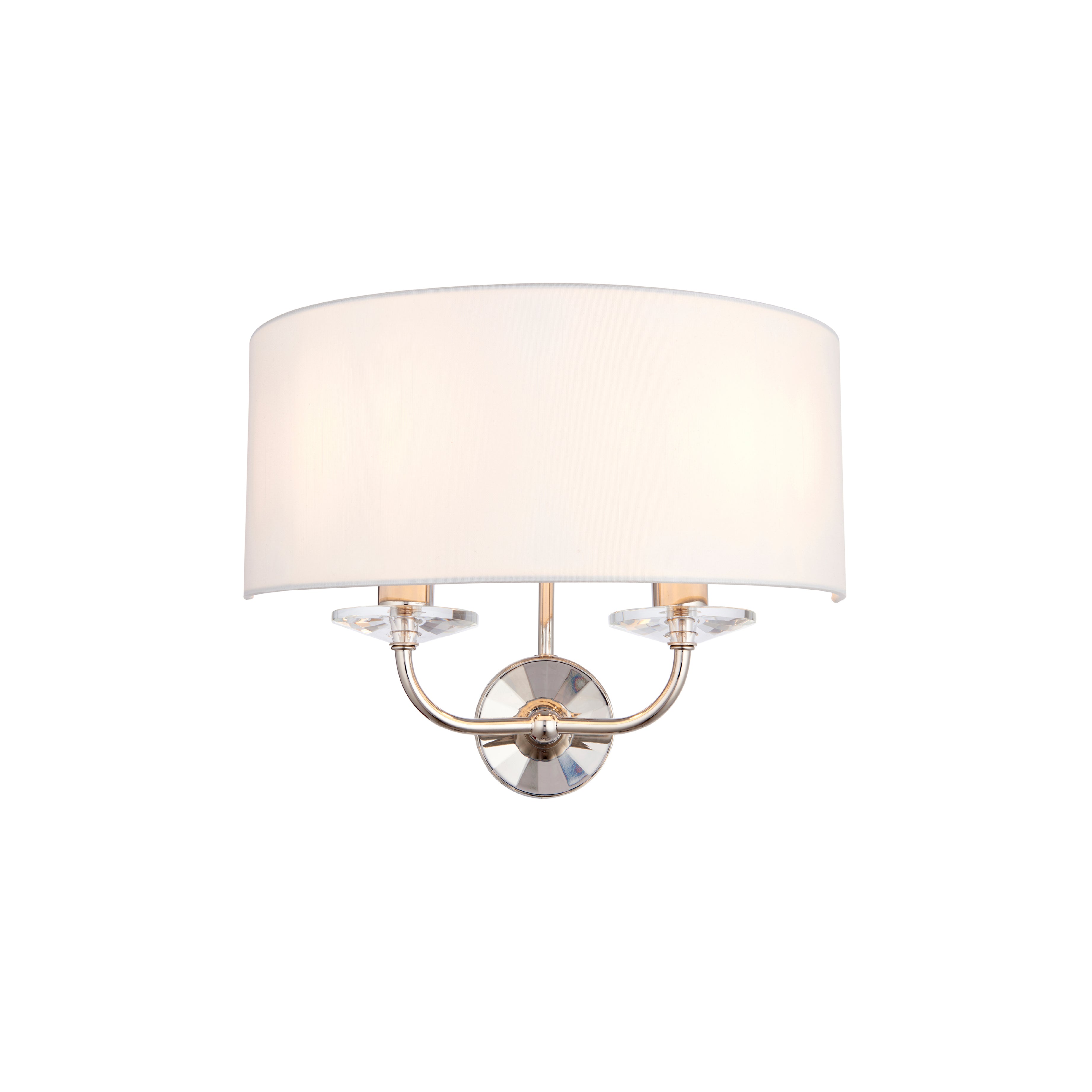 This twin light wall fitting is finished in a bright nickel plate. The arms are complimented with a touch of crystal and the fitting is topped with a vintage white, faux silk semi circular shade. Dimmable and suitable for use with LED lamps.