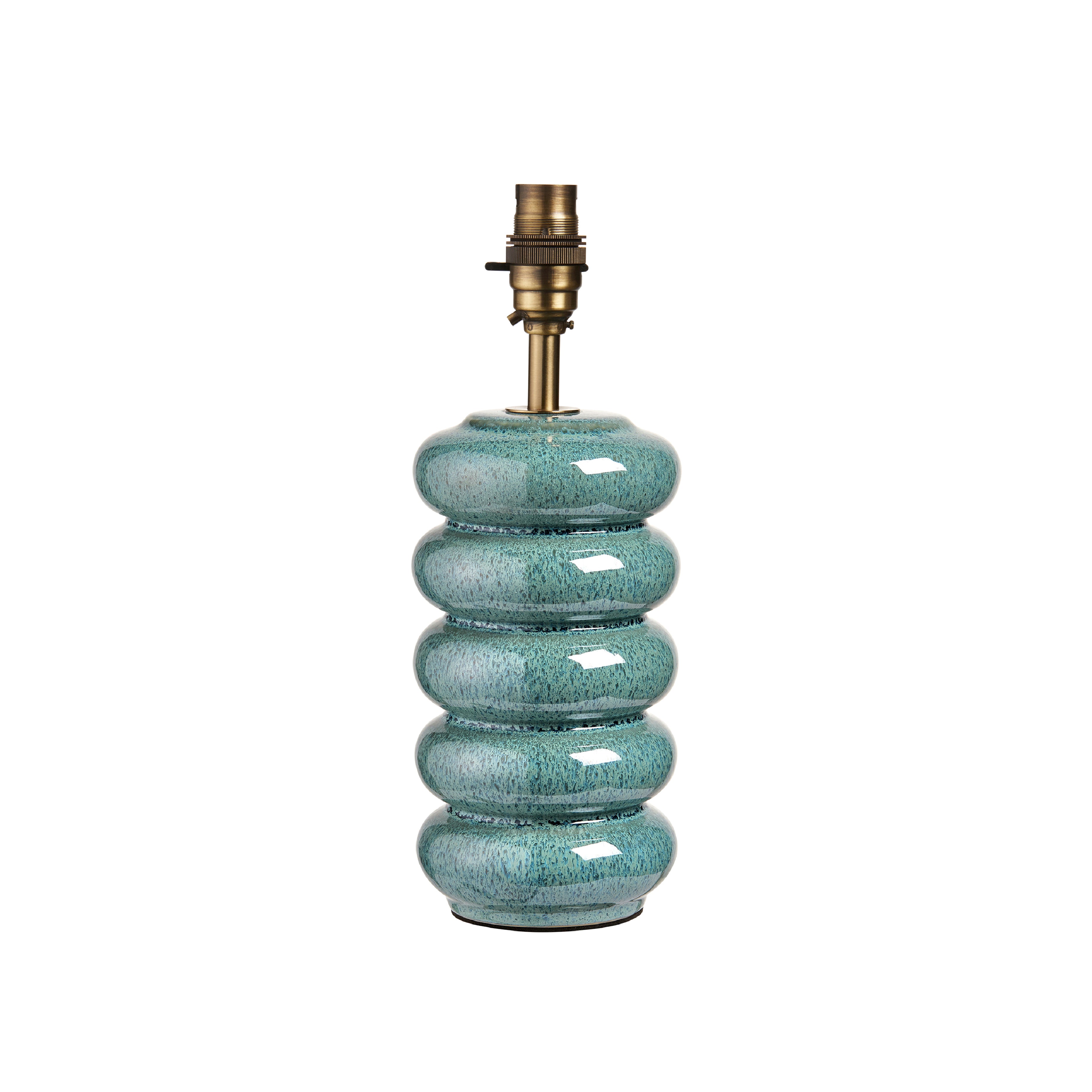 Delicate curves of this ceramic table light base have been perfectly scaled to suit bedrooms and lounge interiors. The handmade ceramic lamp base is finished in a beautiful ocean spray colour reactive glaze, making each piece unique. With brushed aged brass B22 switched lamp holder and grey braided flex.