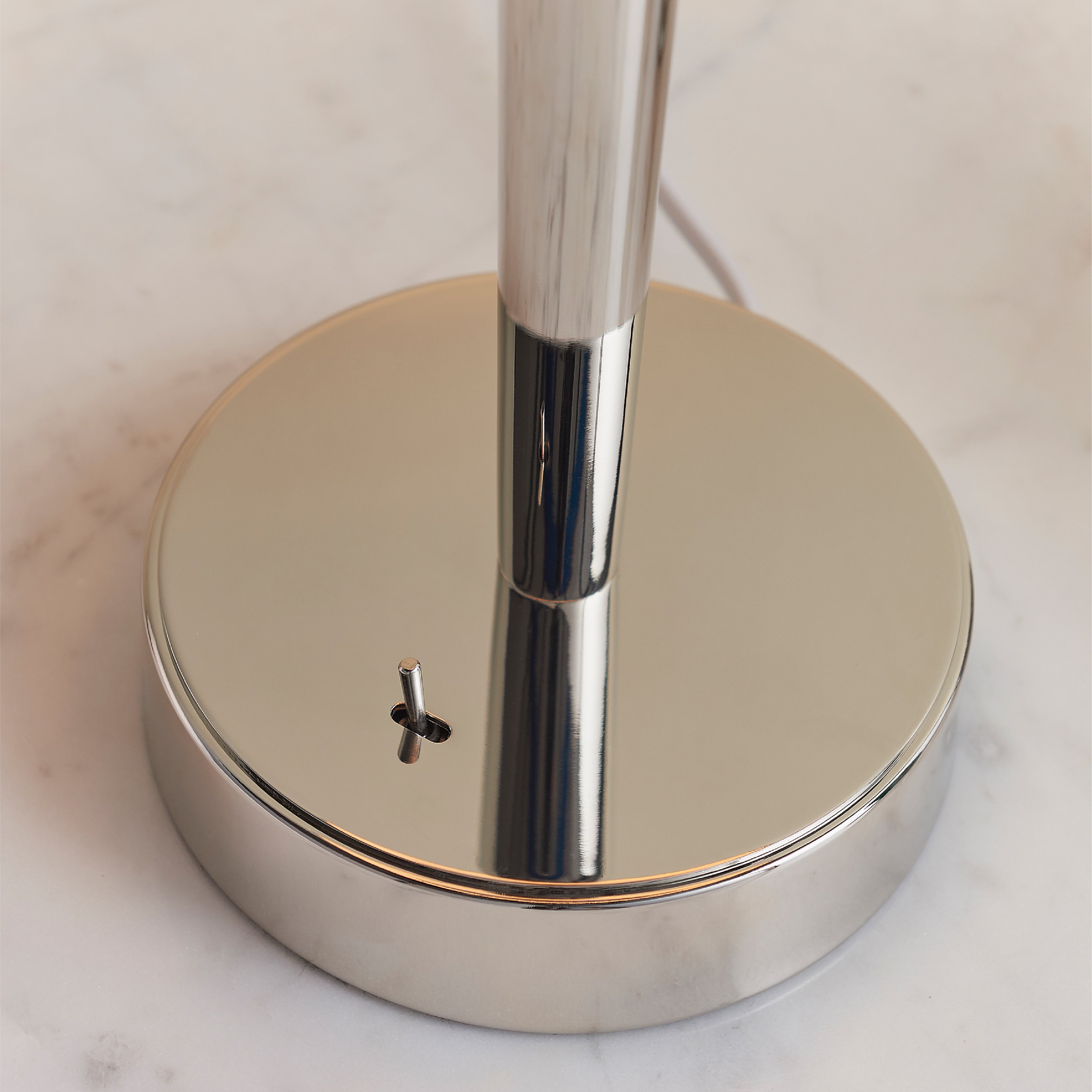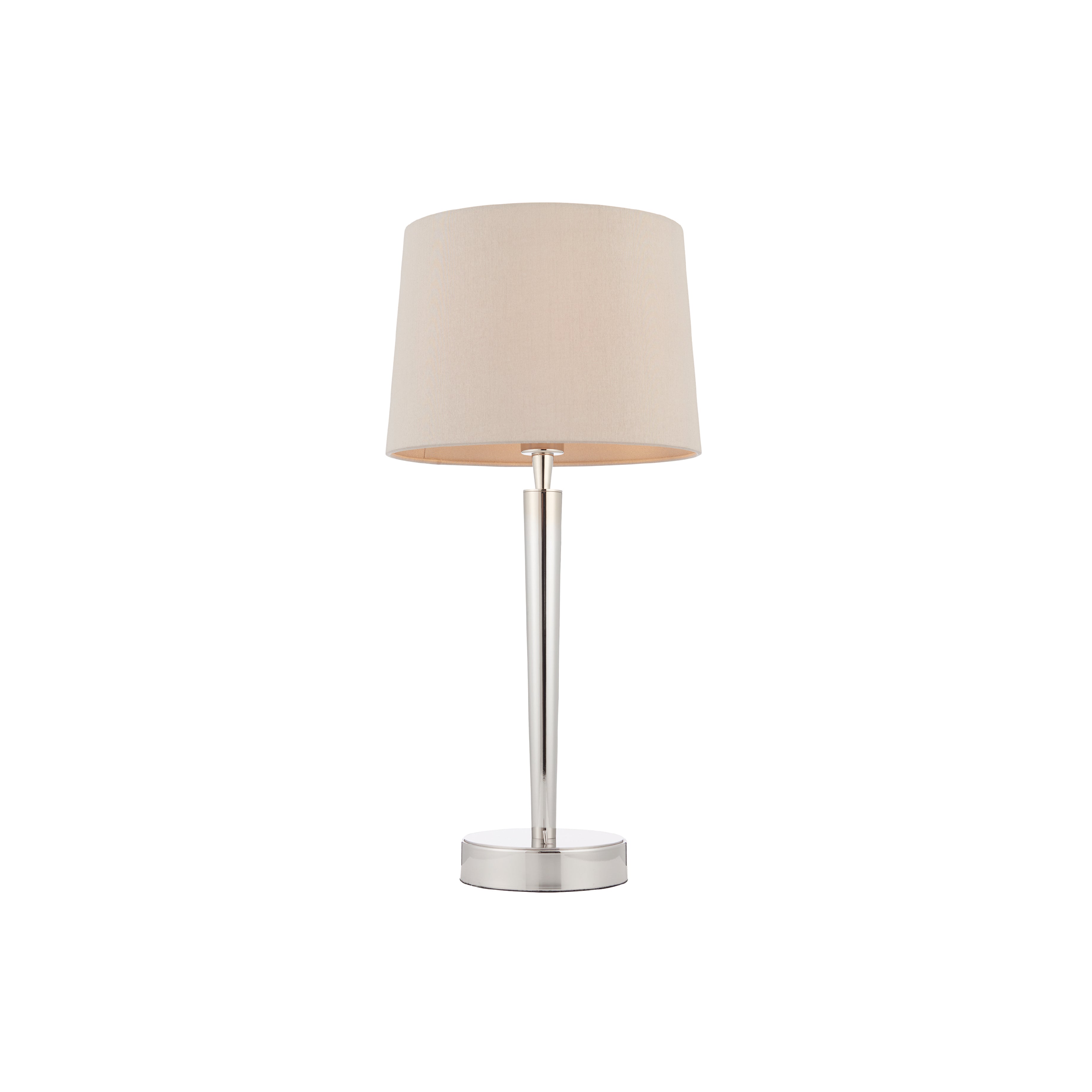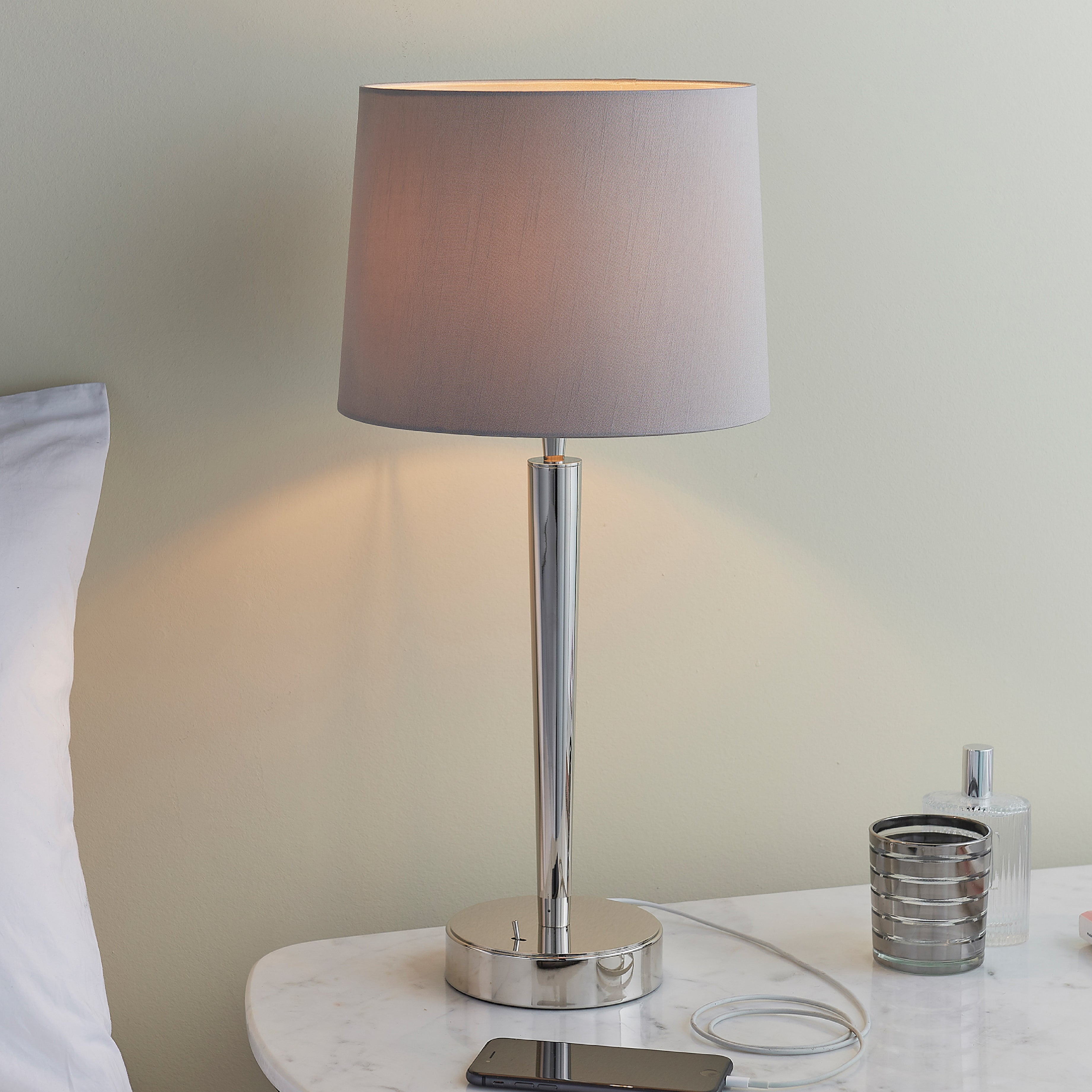 A simple, elegant table lamp with the added advantage of a USB port, enabling you to charge your mobile devices without the need for an additional plug socket. Finished in a bright nickel plate with a mink faux silk shade. Compatible with LED lamps.