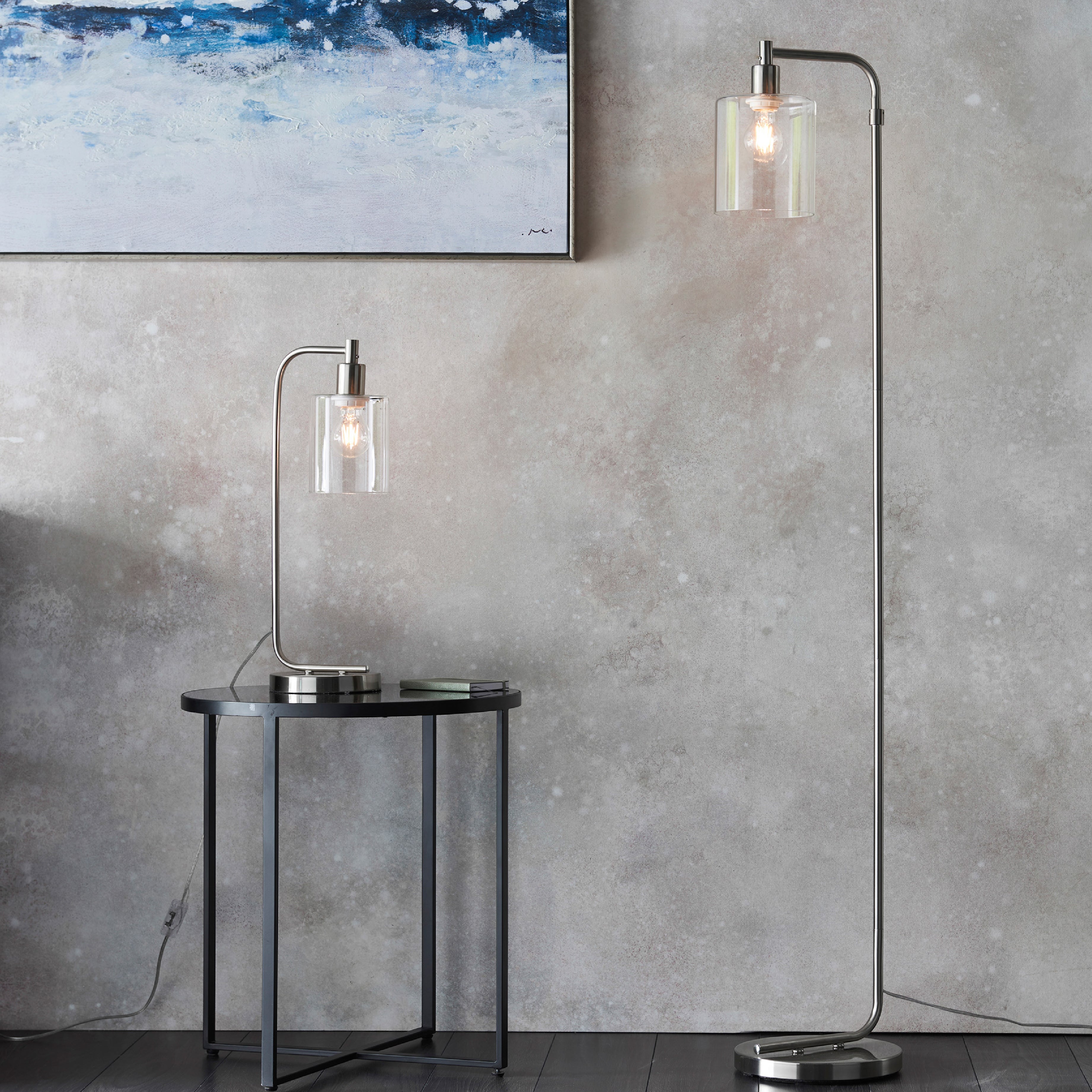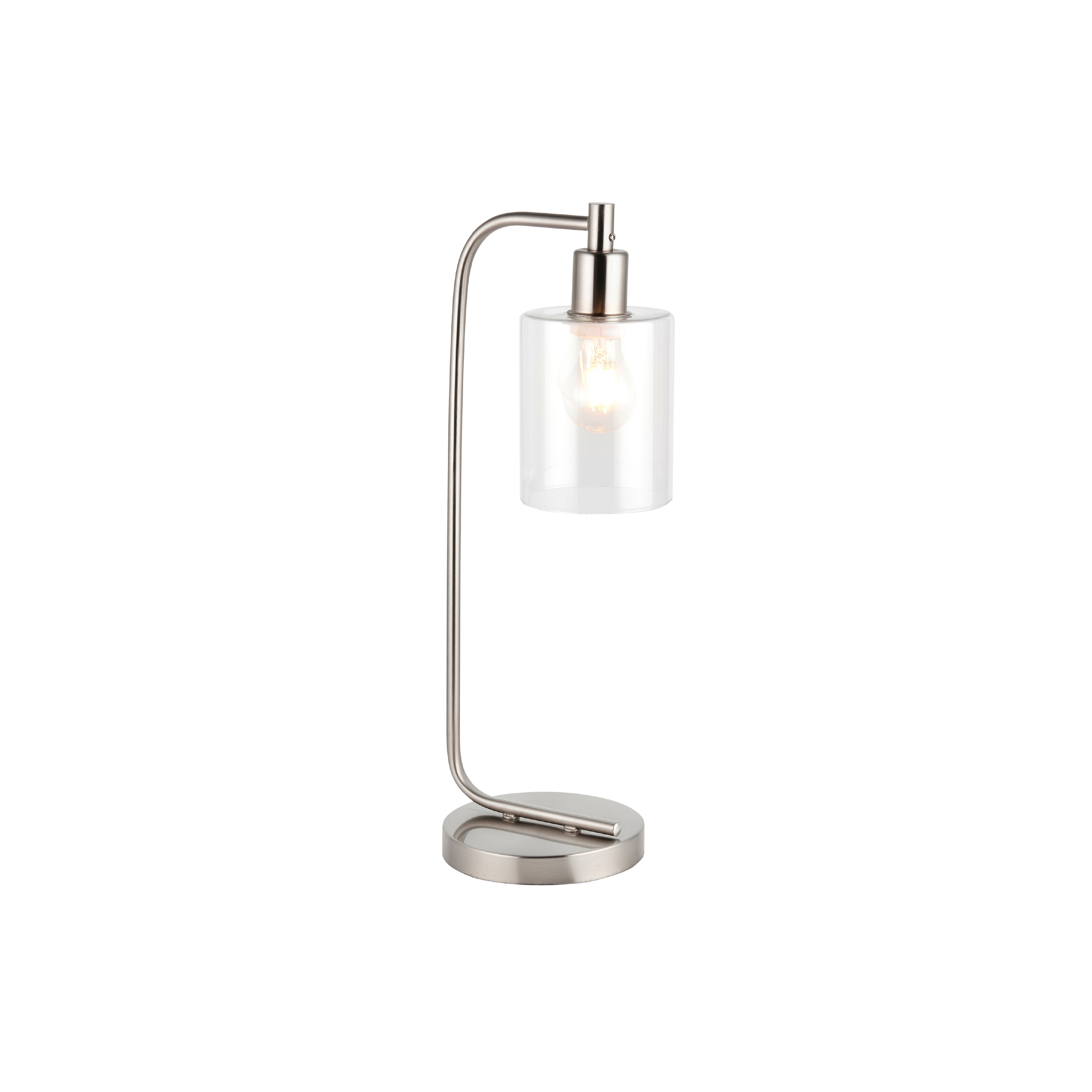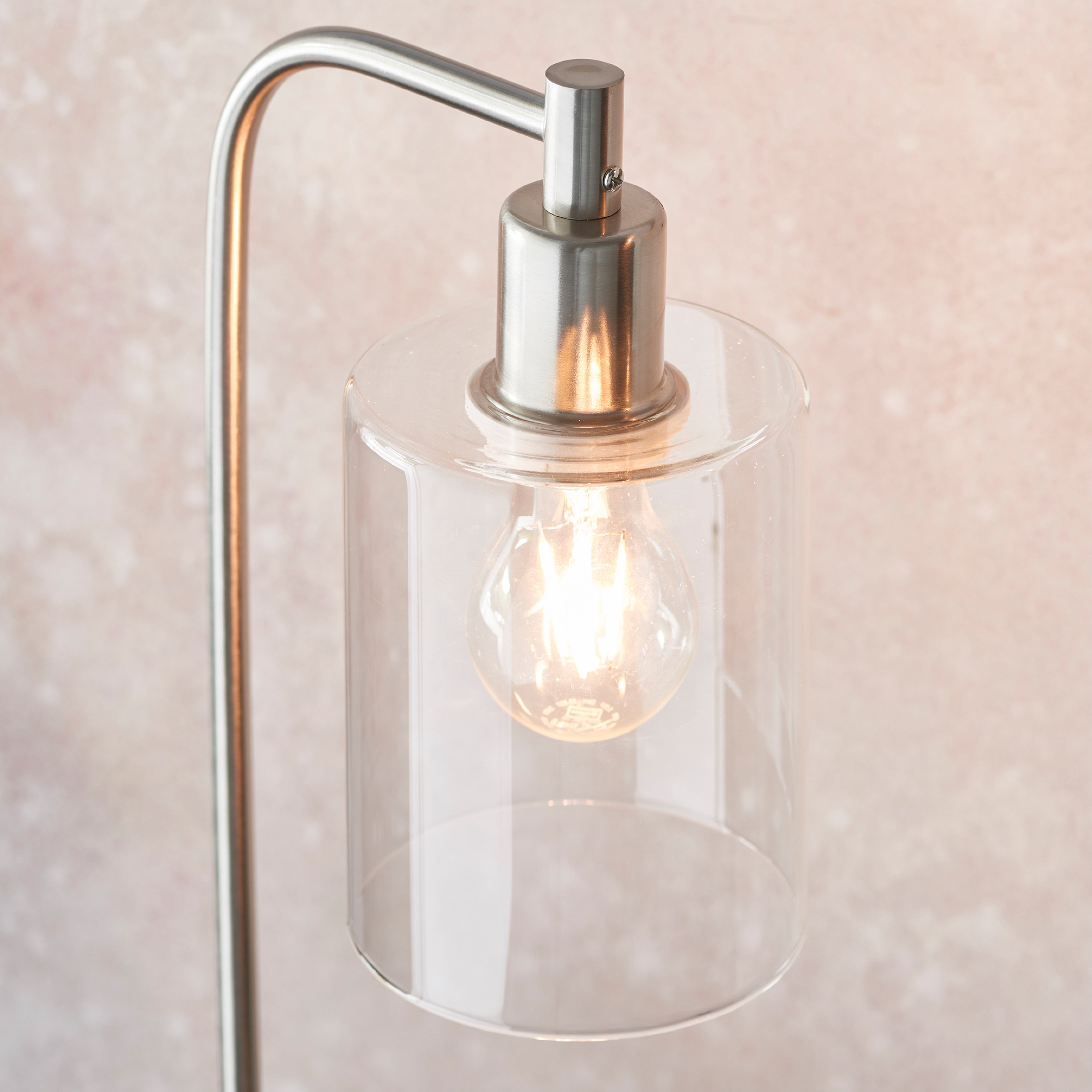 A modern table light for contemporary interiors. Brushed nickel finish with clear glass shade and inline switch.