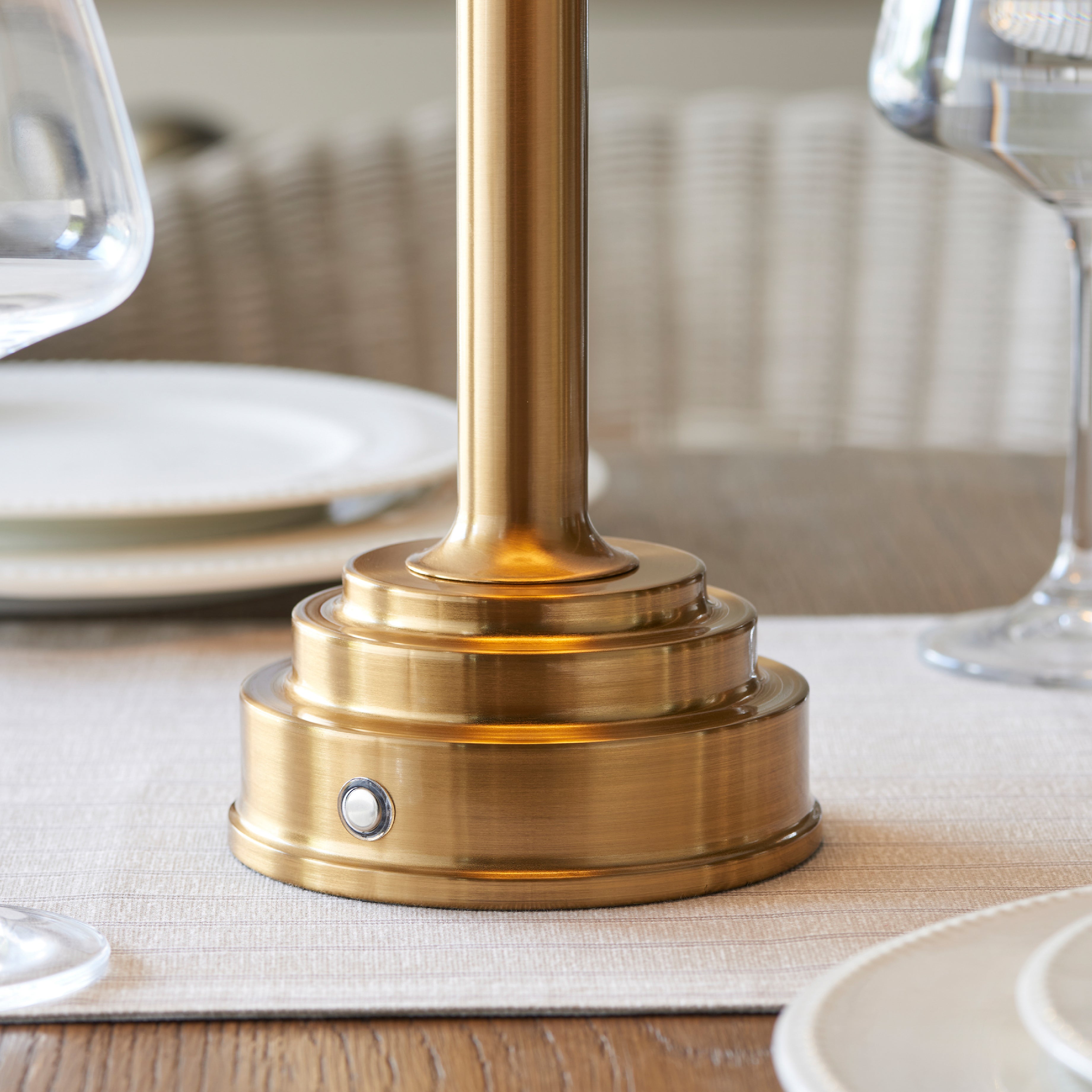 Not tied down by the need for a power cable, this portable, rechargeable 3 stage touch dimmer table lamp enables you to select your own level of light. Classic in style with stepped base and finished in aged brass making it easy to place around your home. Turns on for low light then touch controlled to increase light level to medium then bright, making it the perfect bedside light. Taking just 5 hours to fully charge and giving up to 30 hours of continuous light. Be creative! Place on shelving, hallways, bedsides or dining tables, a totally versatile addition to your home.