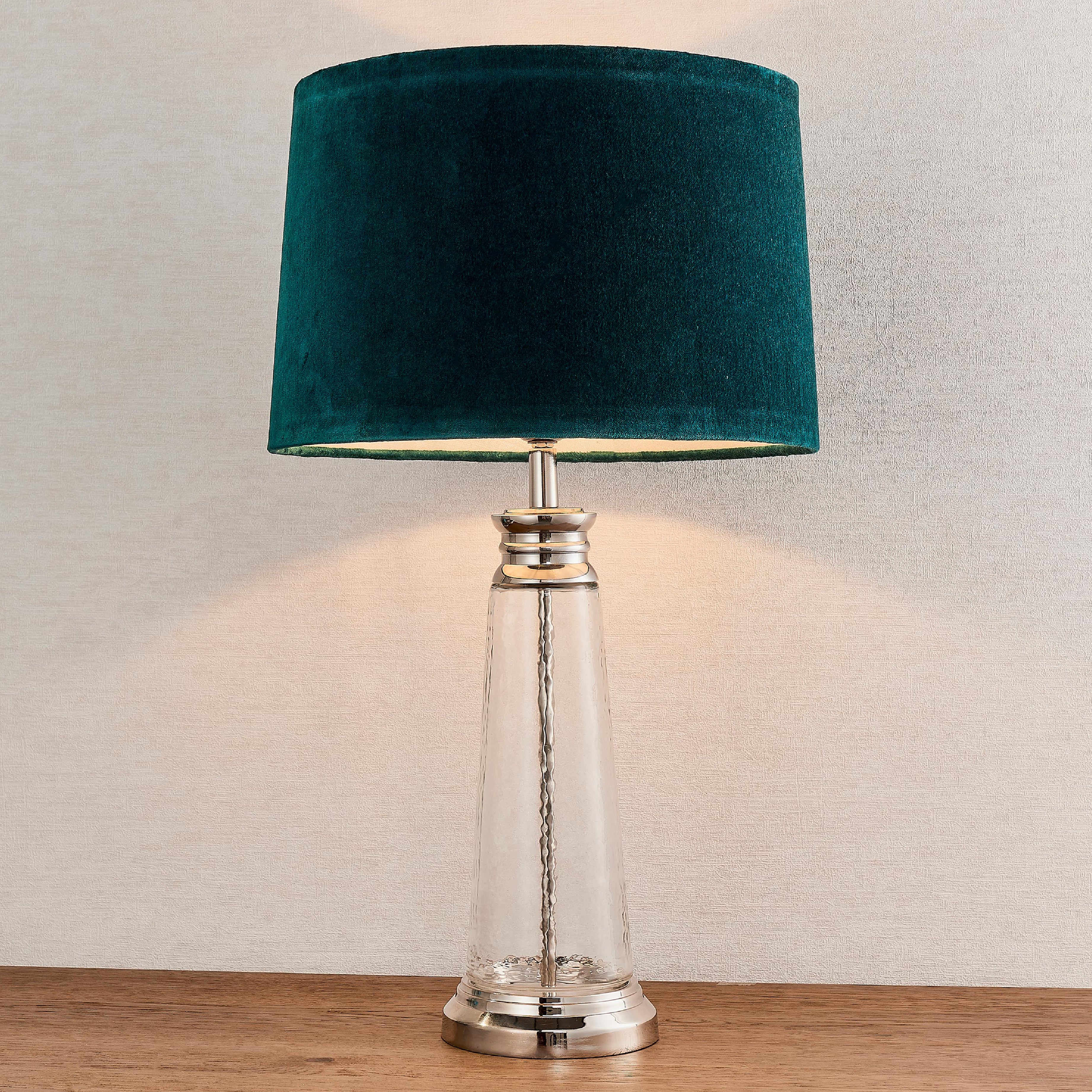 Trendy designer style table light with a clear hammered glass base perfectly partnered with a gorgeous teal velvet shade. Complete with in-line switch.