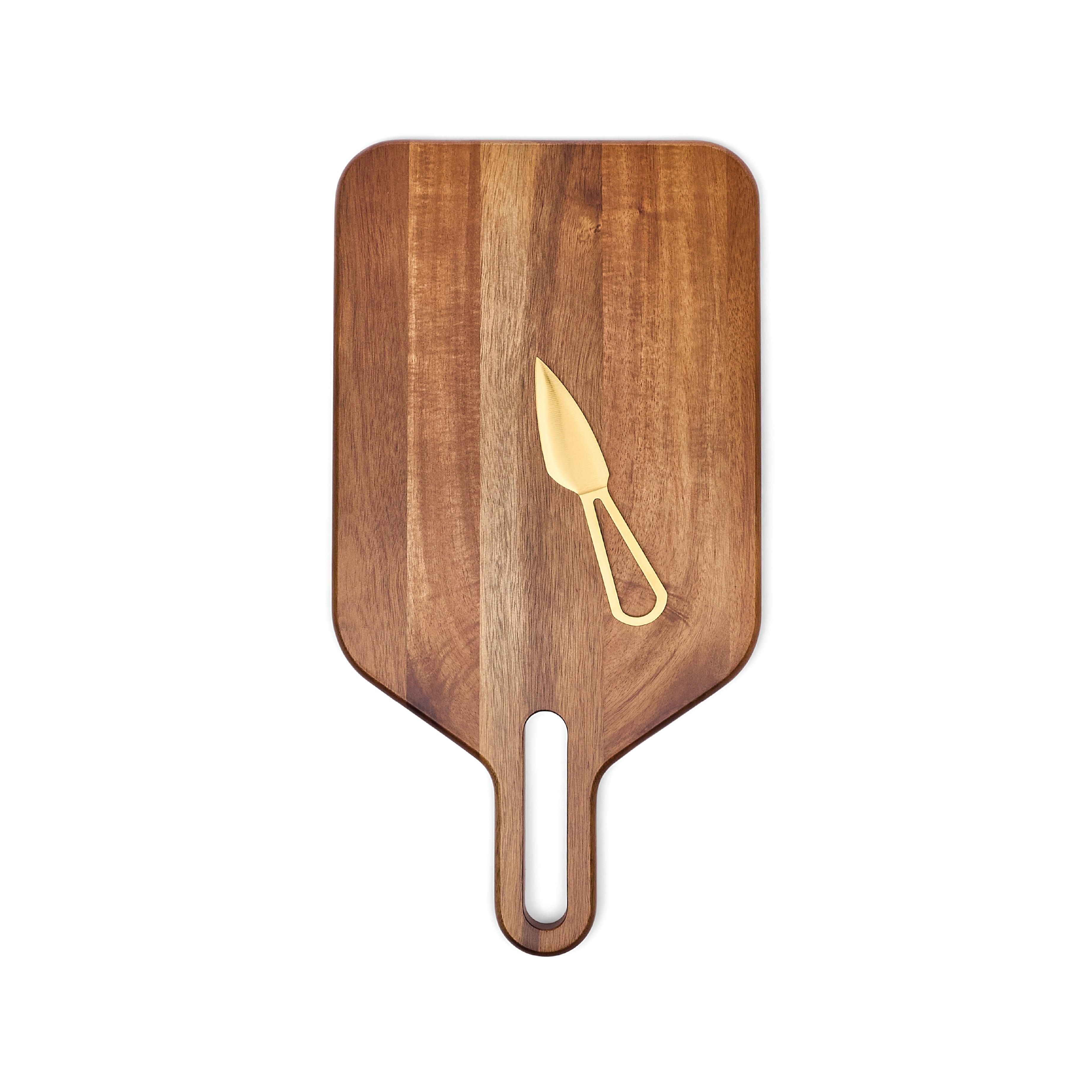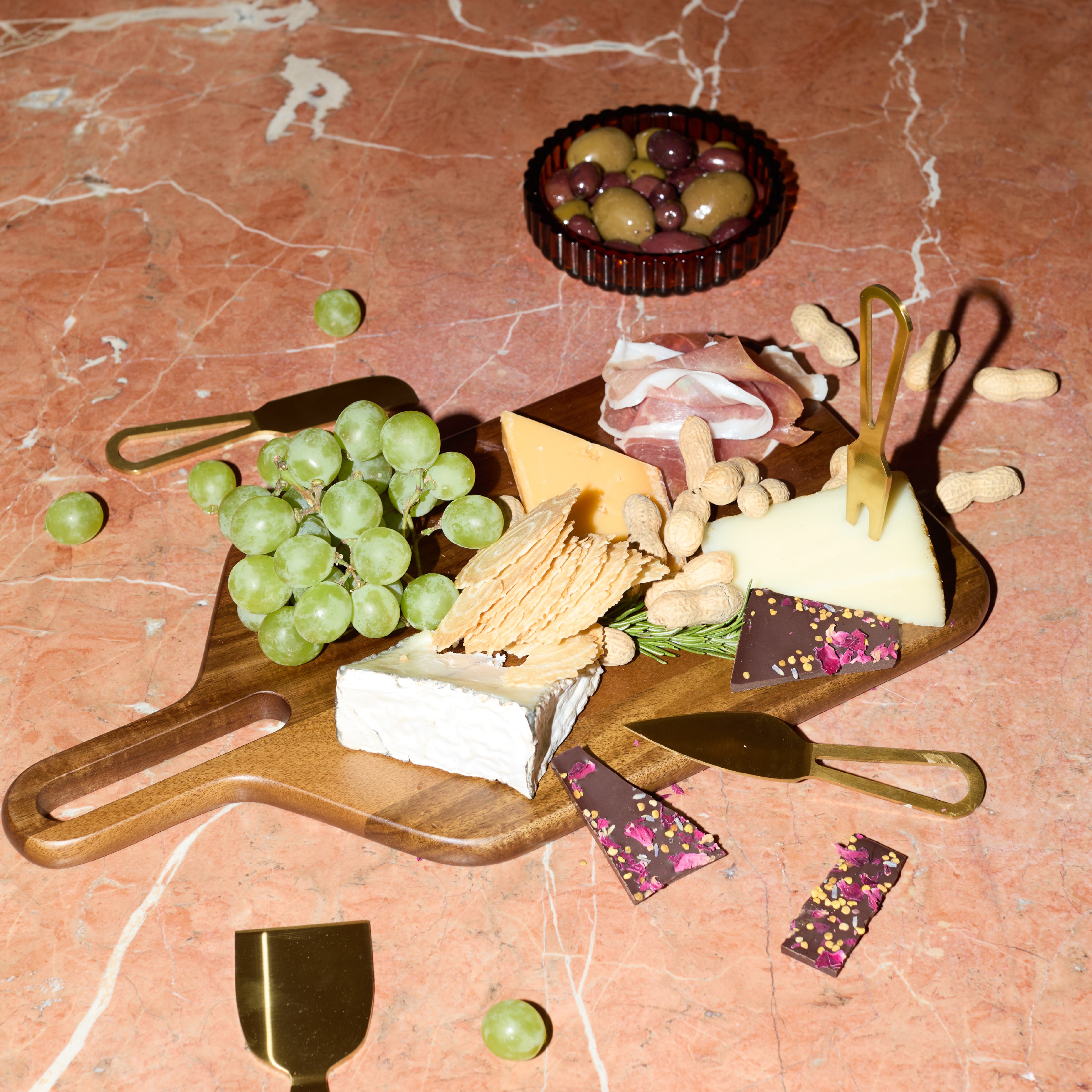 The garth cheese board and knife set by Here’s How is a great addition to any occasion especially a charcuterie spread. The set combines the natural beauty of acacia wood with the luxurious shine of gold.