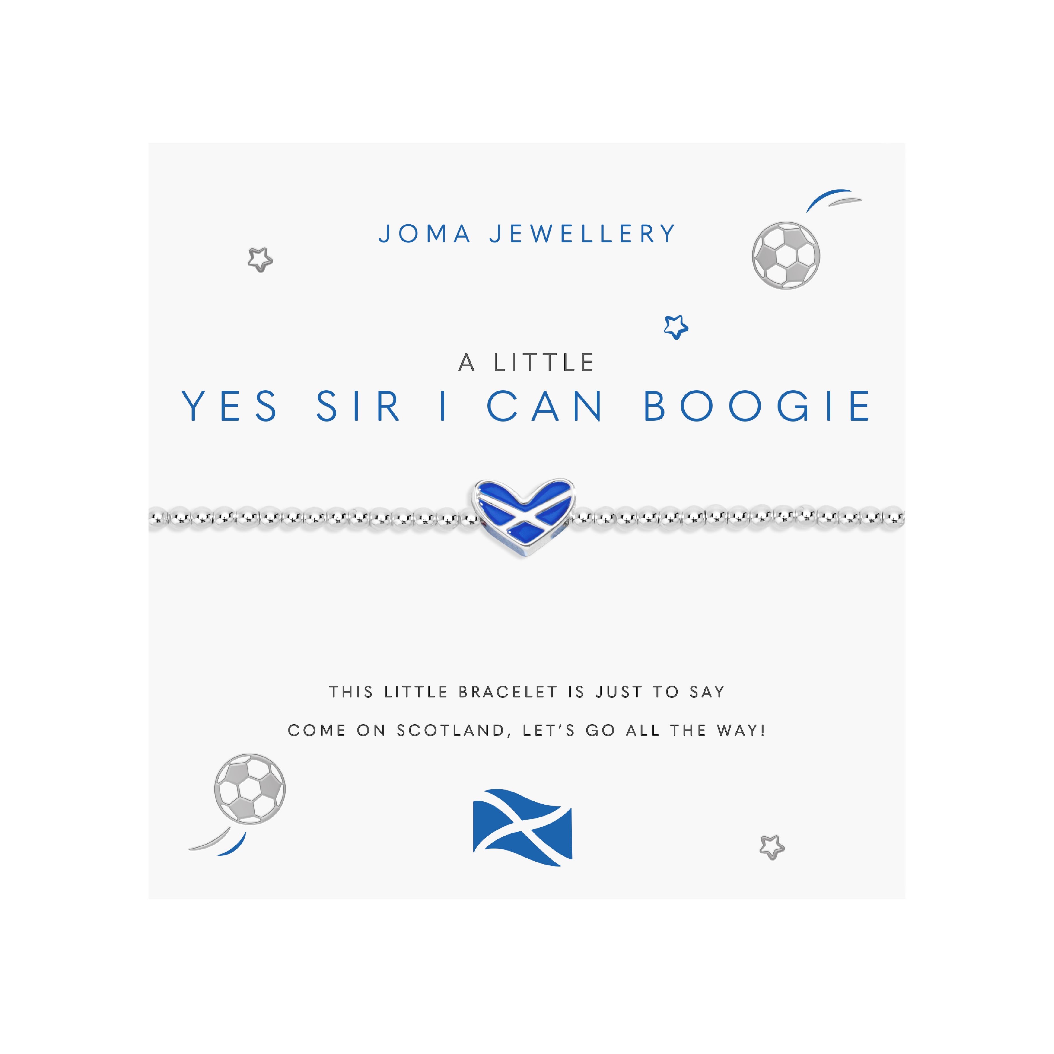 Joma Jewellery’s A Little says a lot. This beautiful beaded bracelet is crafted from silver plated brass - and comes threaded with a heart-shaped charm featuring Scotland's flag in brilliant blue and white. Carded with a silver stamped sentiment and contained within a luxury ribbon tied gift bag for good measure: Joma’s is the go-to accessory for patriotic football fanatics.