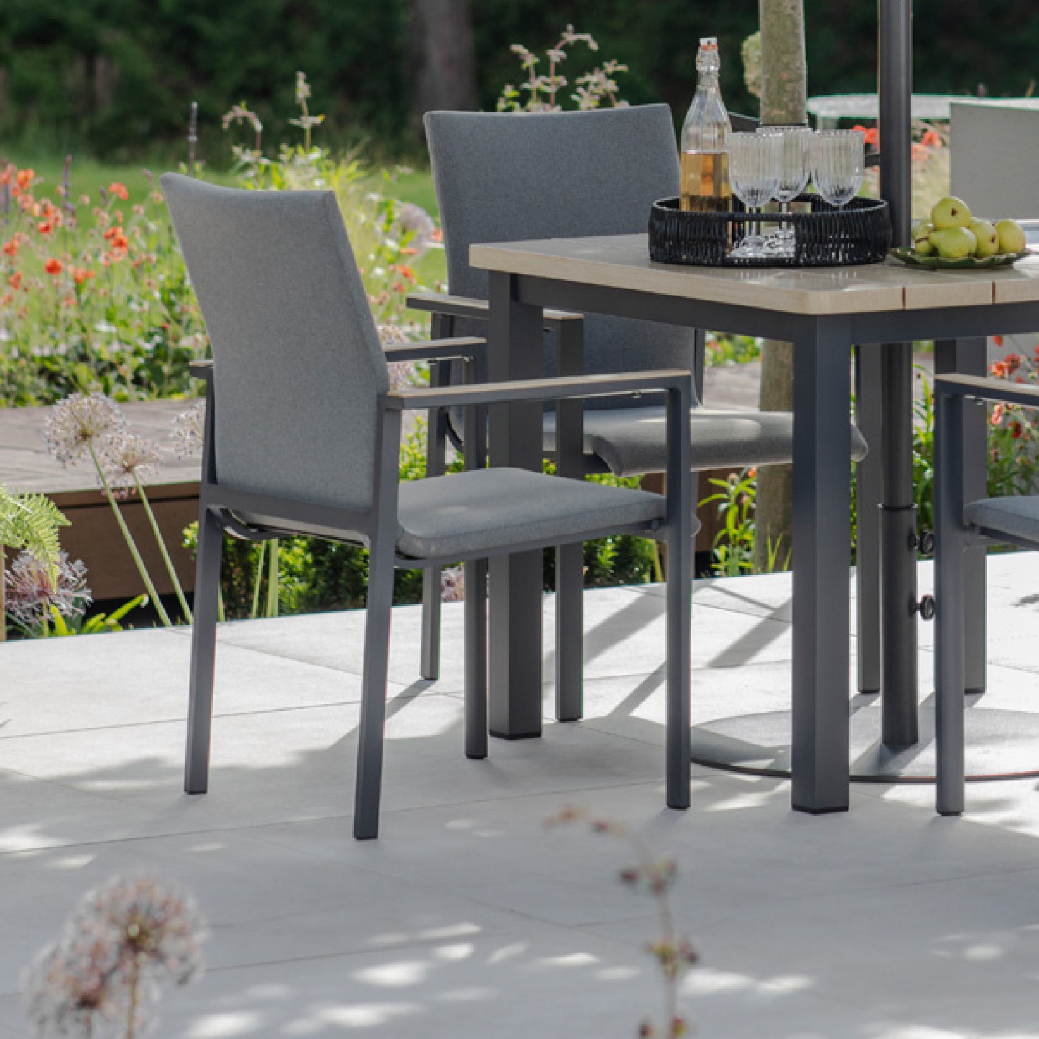 Featuring sleek double powder coated aluminium frames with rustic wood effect accents - LG’s square dining table of their Venice Collection boasts the best in both form and function. Please note: chairs and parasol are not included.