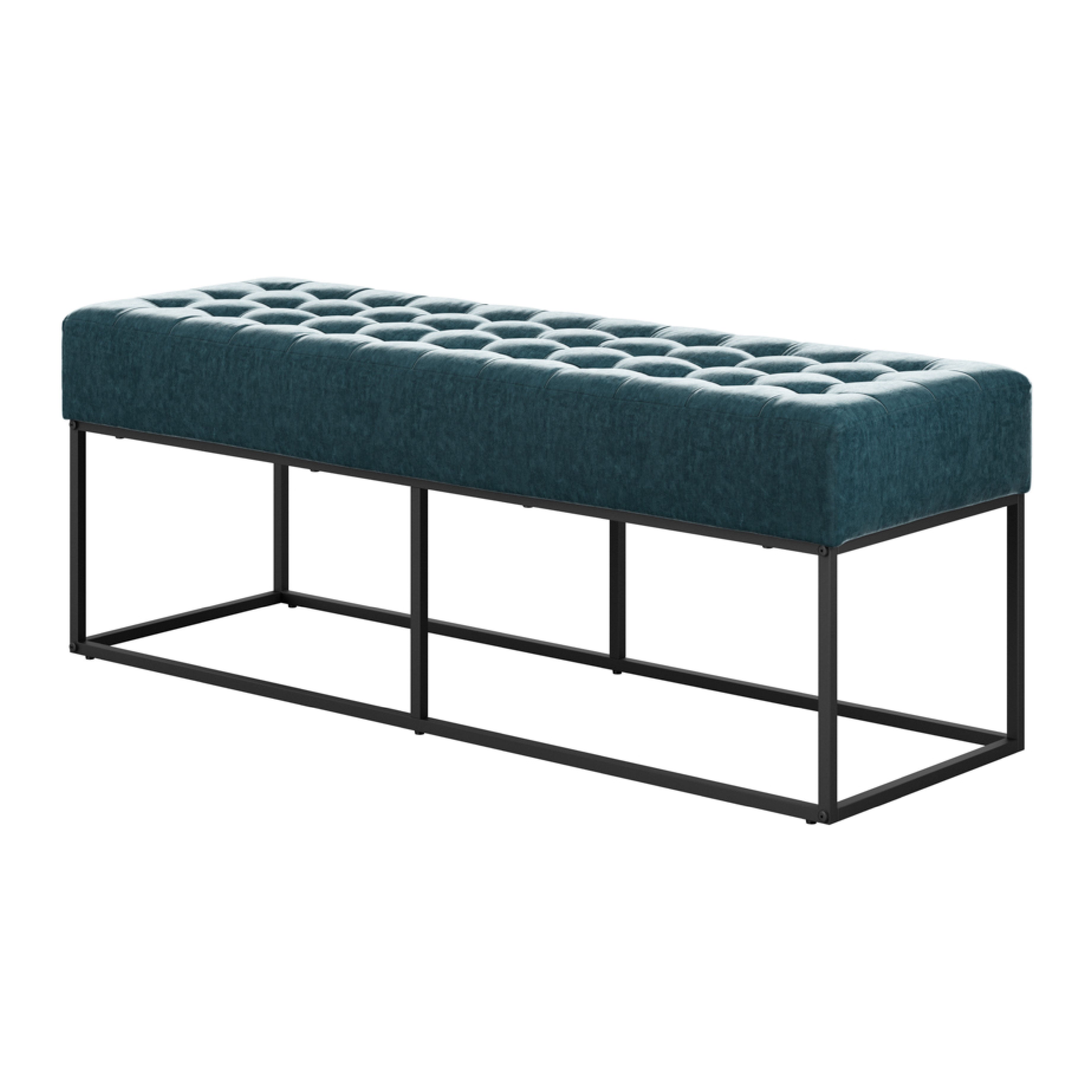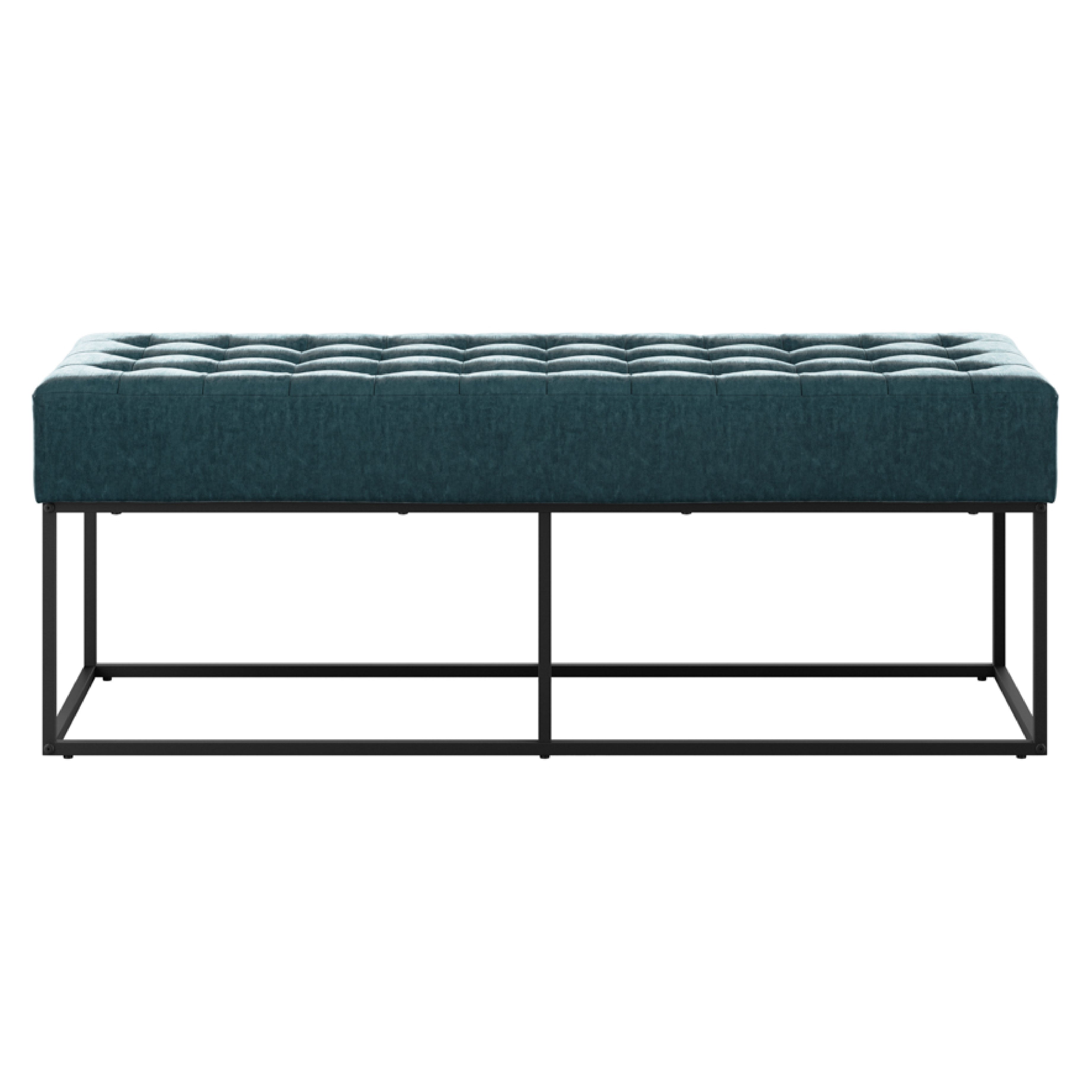 Meet the Boden Bench in Yale Blue. This bench features a cushioned seat and chic industrial-effect metal frame, offering practicality and style for any home. Its versatility knows no bounds, whether as a window seat or extra dining room seating.