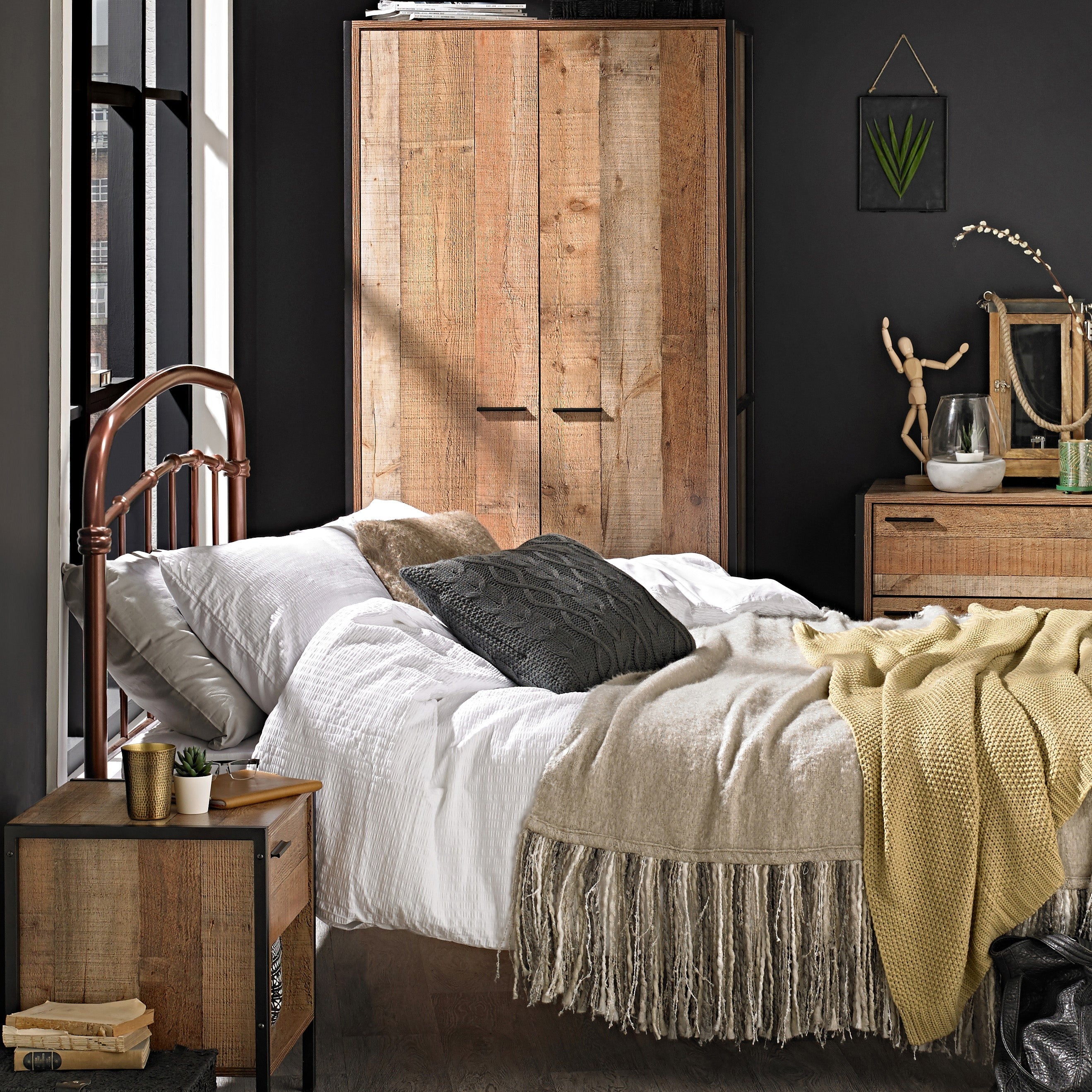 Embrace industrial chic with LPD Home’s Hoxton range. Featuring wardrobes, a bed, a chest of drawers, a dressing table, and a bedside, this collection offers an affordable style for modern homes. Inject contemporary flair with the rustic charm of distressed oak.