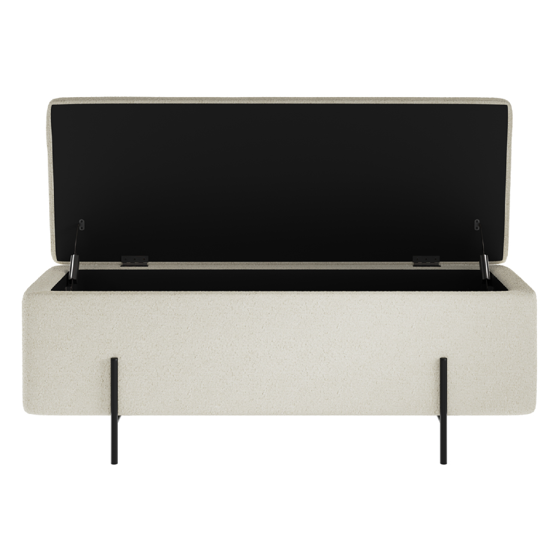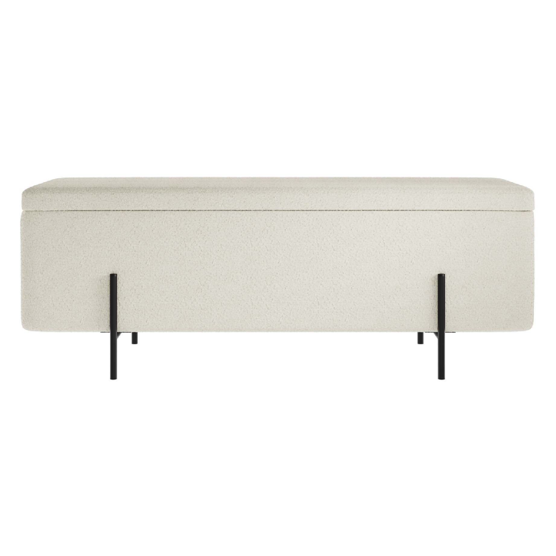 LPD Home’s Lola Boucle Storage Ottoman features a cushioned bench seat in textured ivory boucle atop matte black legs, creating a simple and stylish statement. Lola combines classic and timeless design with practical storage, allowing you to store your belongings in style.