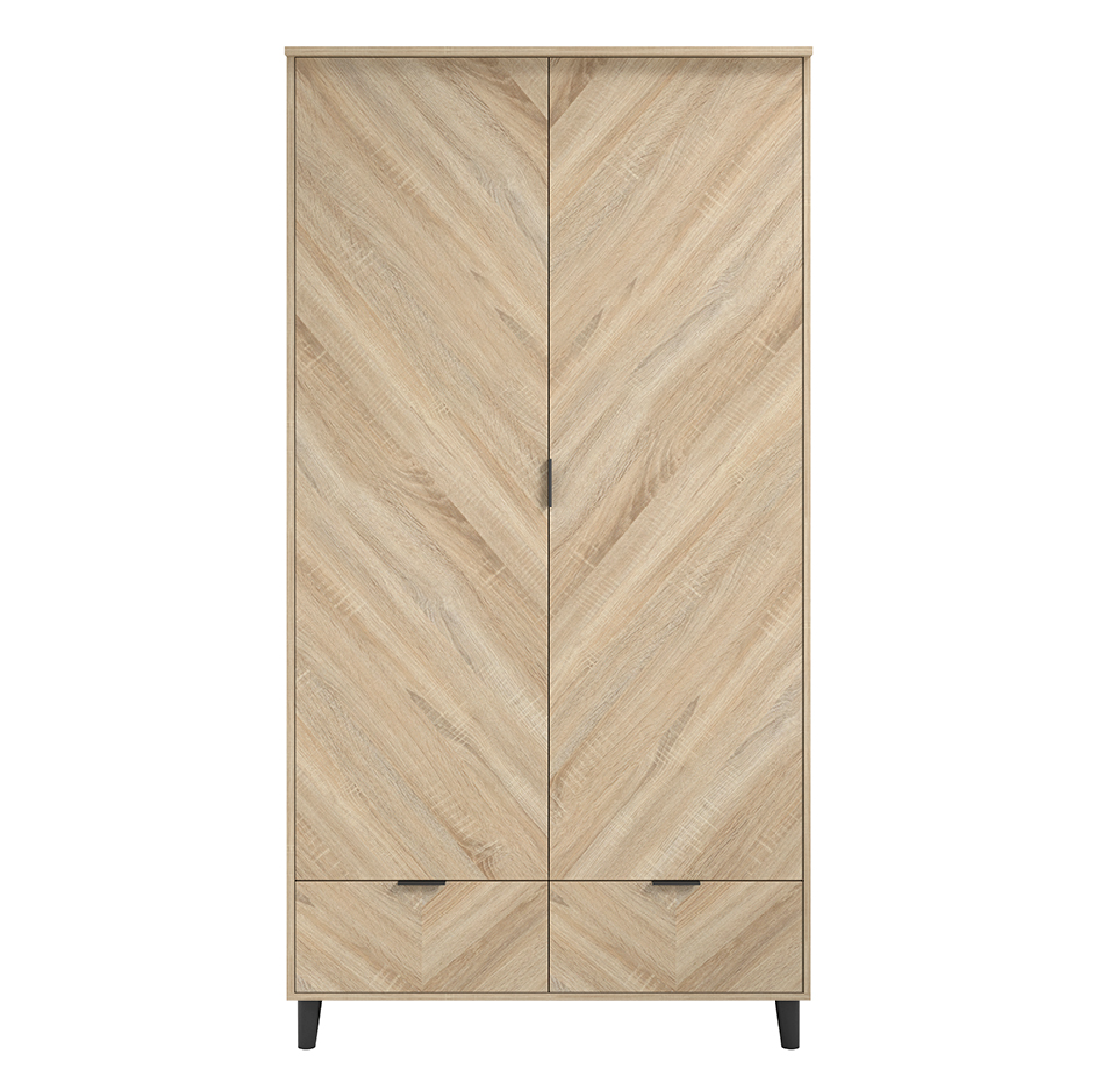 Elevate your storage game with LPD Home’s Stockholm 2-door wardrobe, which blends modern design and functional elegance. It's compact yet spacious and ideal for smaller spaces or as a standout piece. With its striking chevron pattern in Sonoma Oak and matte black legs, this wardrobe brings a contemporary flair to your space.